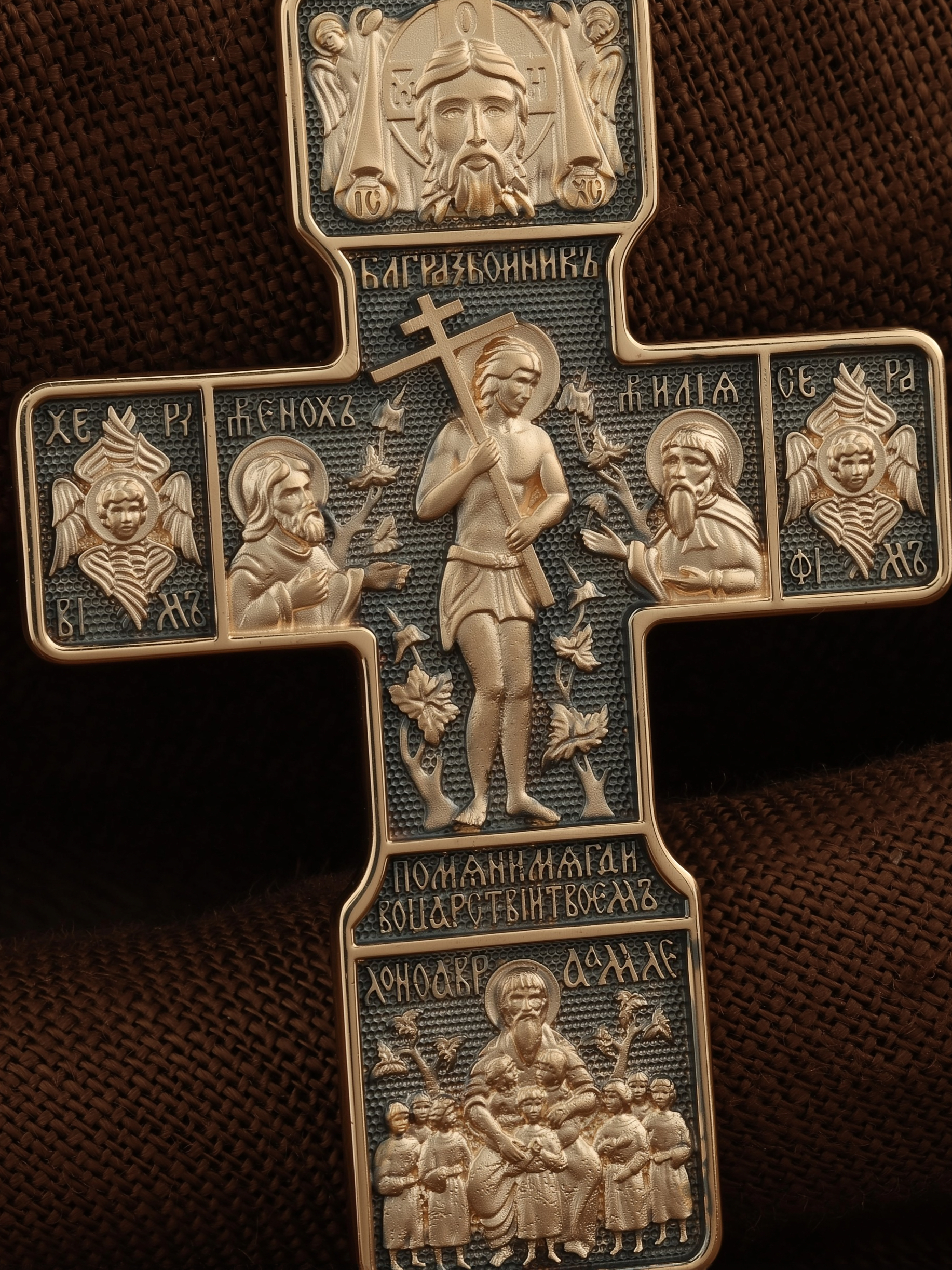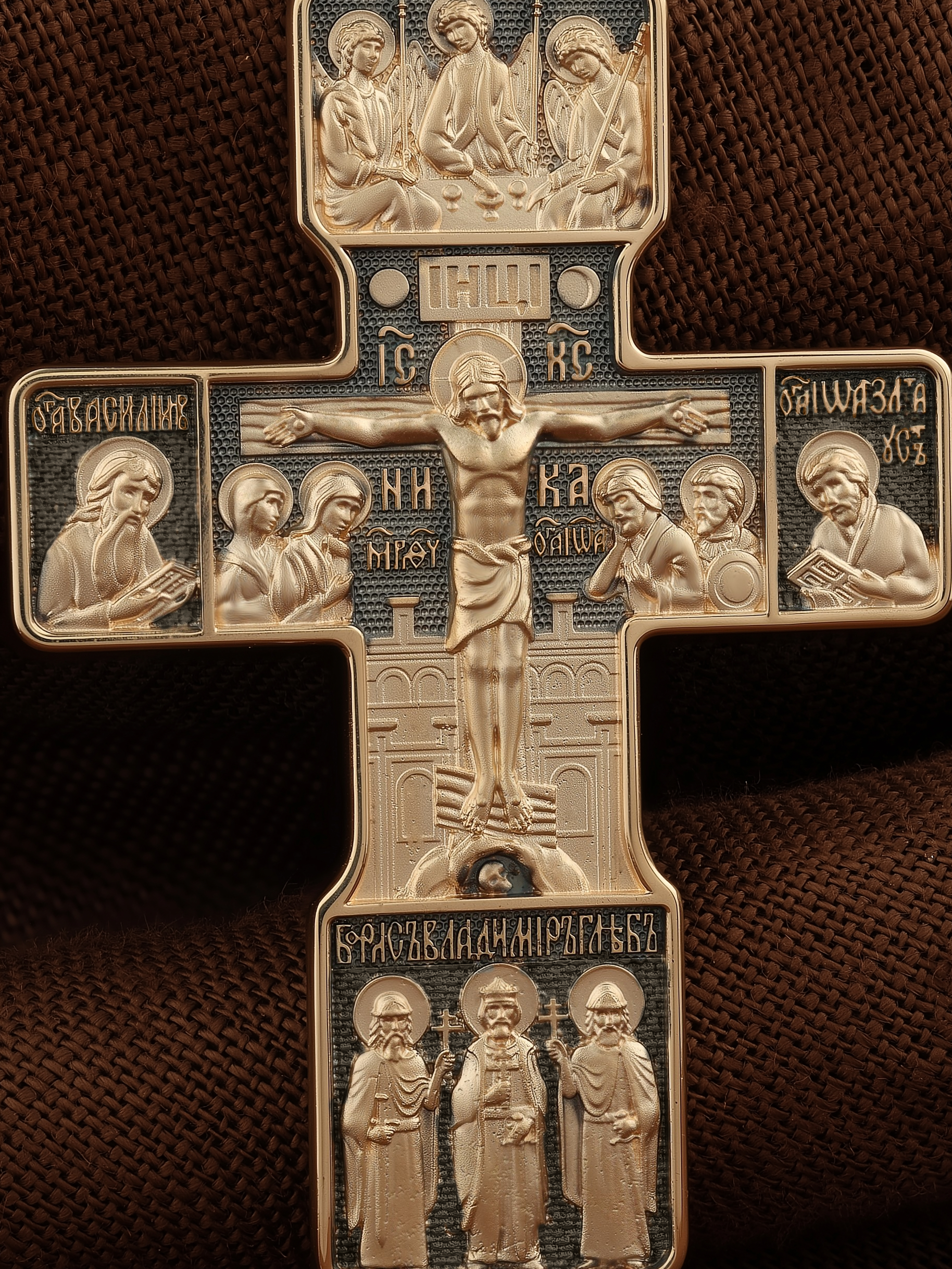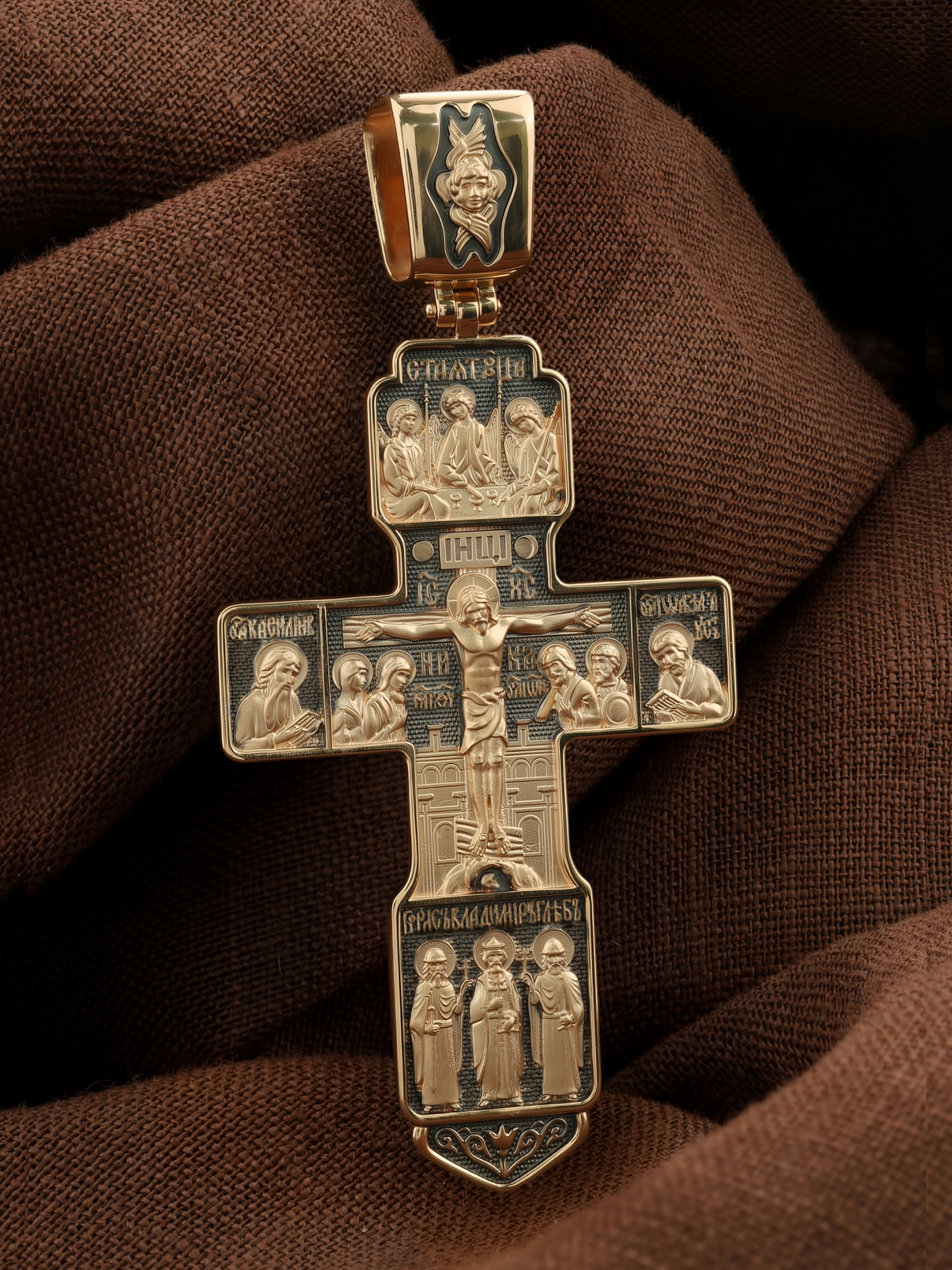 На концах горизонтальной балки креста помещены образы вселенских святителей и творцов литургии Василия Великого и Иоанна Златоуста. В кулонном кольце изображены райские врата с их стражем — Херувимом. Врата, которые открылись благодаря крестной жертве Христа.