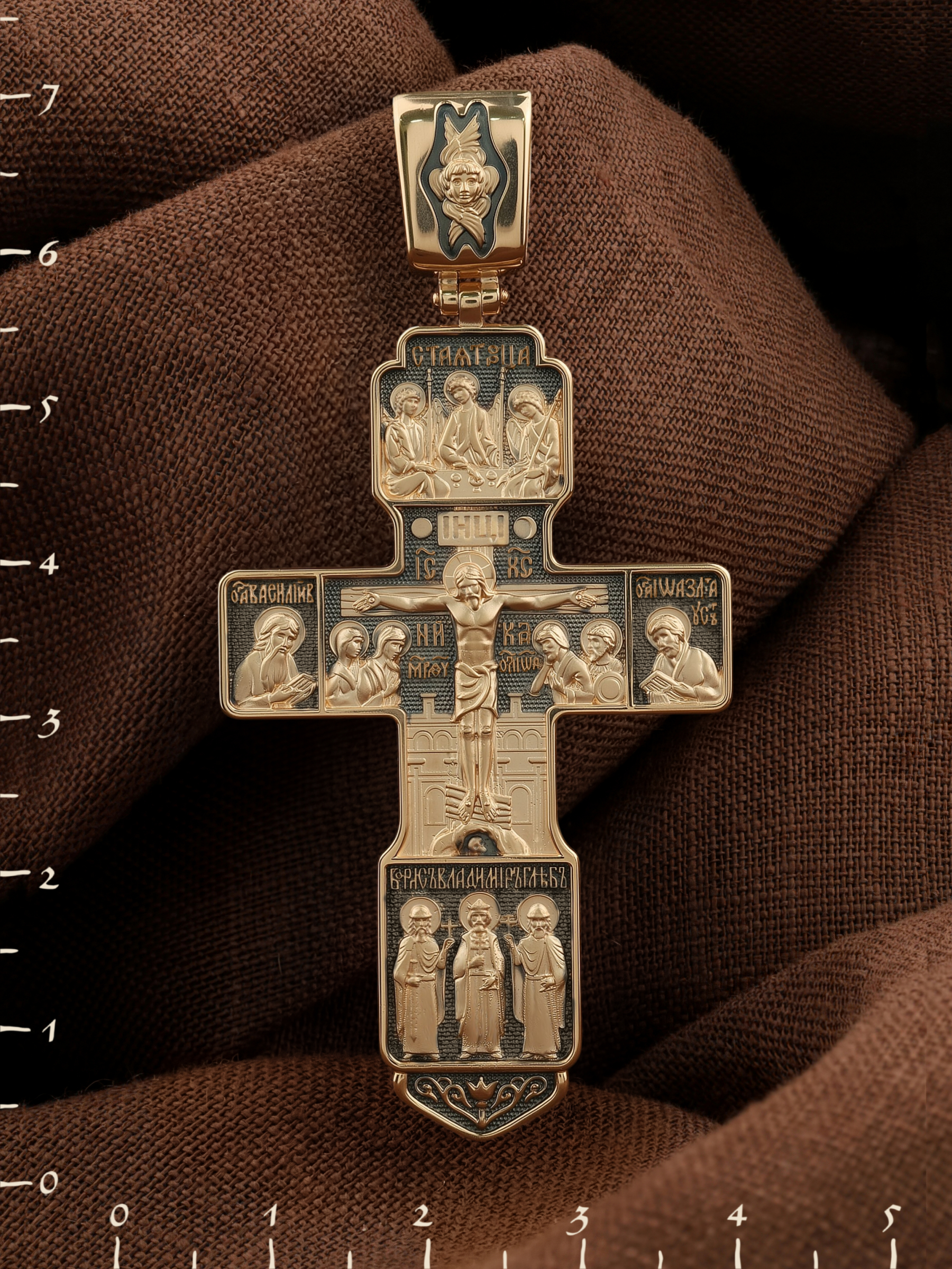 В нижней части креста изображены образы первых русских святых князей-мучеников — Бориса (князь ростовский) и Глеба (князь муромский) и святого равноапостольного князя Владимира. Страстотерпцам Борису и Глебу молятся об умиротворении Отечества, о добром нраве властей и правителей, о сохранении от междоусобицы, о даровании мужества перед лицом смертельной опасности. С Борисом и Глебом неразрывно связан образ их отца — святого равноапостольного князя Владимира, который также почитается как защитник и покровитель Русской Земли и Церкви. В молитвах его называют «отец русский» или «отец всея Руси».