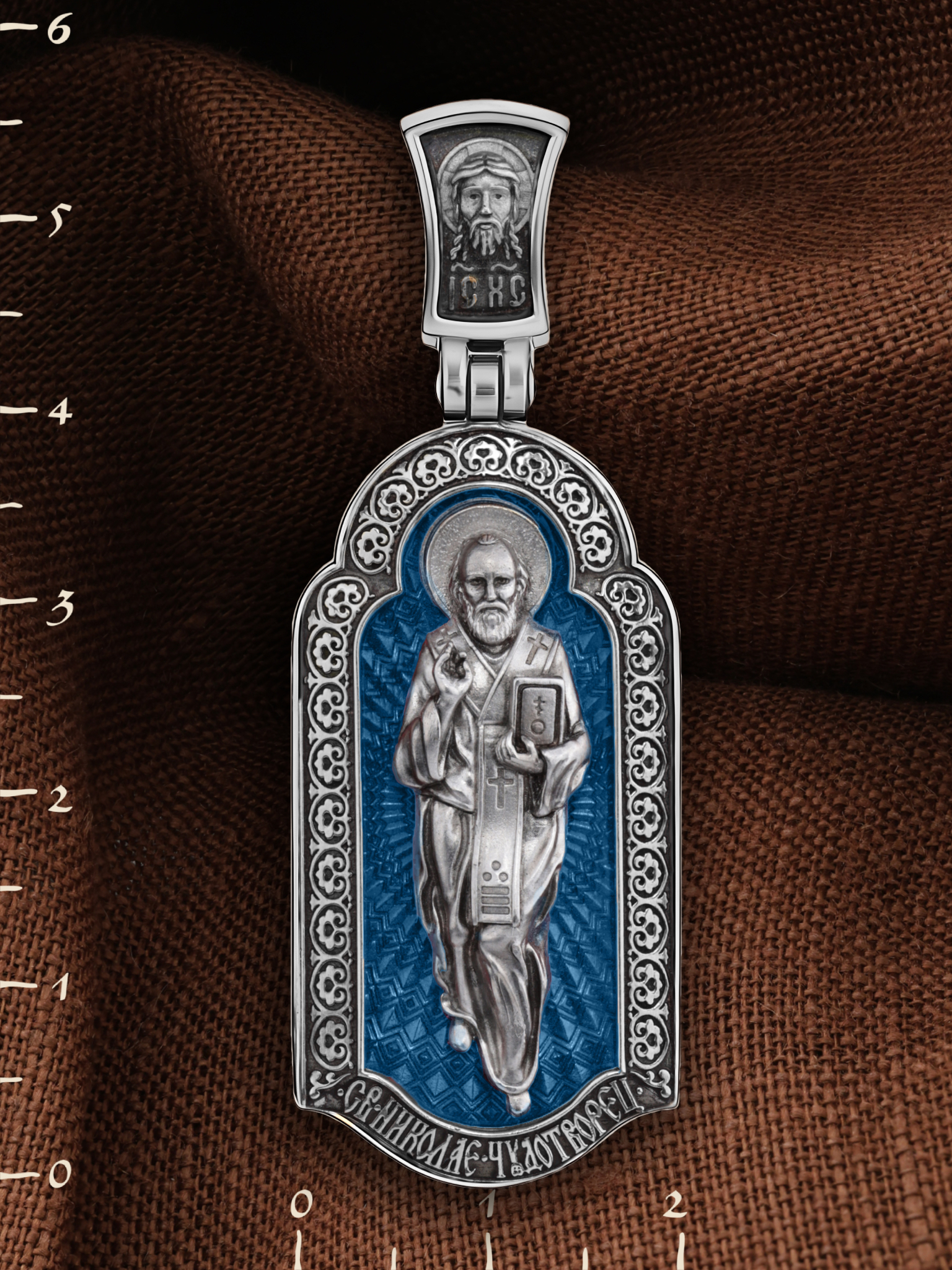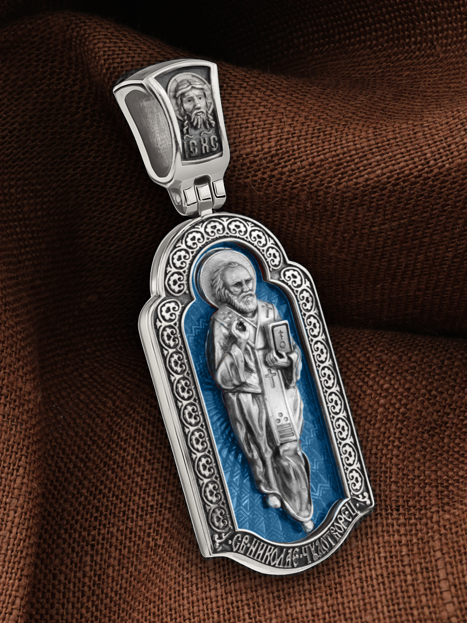 На лицевой стороне образка изображен Святитель Николай архиепископ Мир Ликийских, Чудотворец. Он является одним из самых почитаемых святых в православном мире. Избранник Божий Николай стал вершиной всех добродетелей. С кем из величайших праведников не сравнялся он образом духовной красоты, кому из них не последовал в своих деяниях и чудотворениях? Всеблаженный Николай был кроток, как Моисей, мужественен, как Давид, славен простотой нрава, как Иаков. Словно Ной, он спасал стадо Господне в новом ковчеге от потопа ересей. Вся жизнь святого Николая — это служение Богу. Много великих чудес сотворил на земле и на море великий Святитель Николай Угодник. Он укрощал штормы, спасал от потопления и выносил на сушу из глубины морской, освобождал из плена и приносил освобожденных домой, избавлял от уз и темницы, освобождал от смерти и подавал многим различные исцеления: слепым — прозрение, хромым — хождение, глухим — слух.