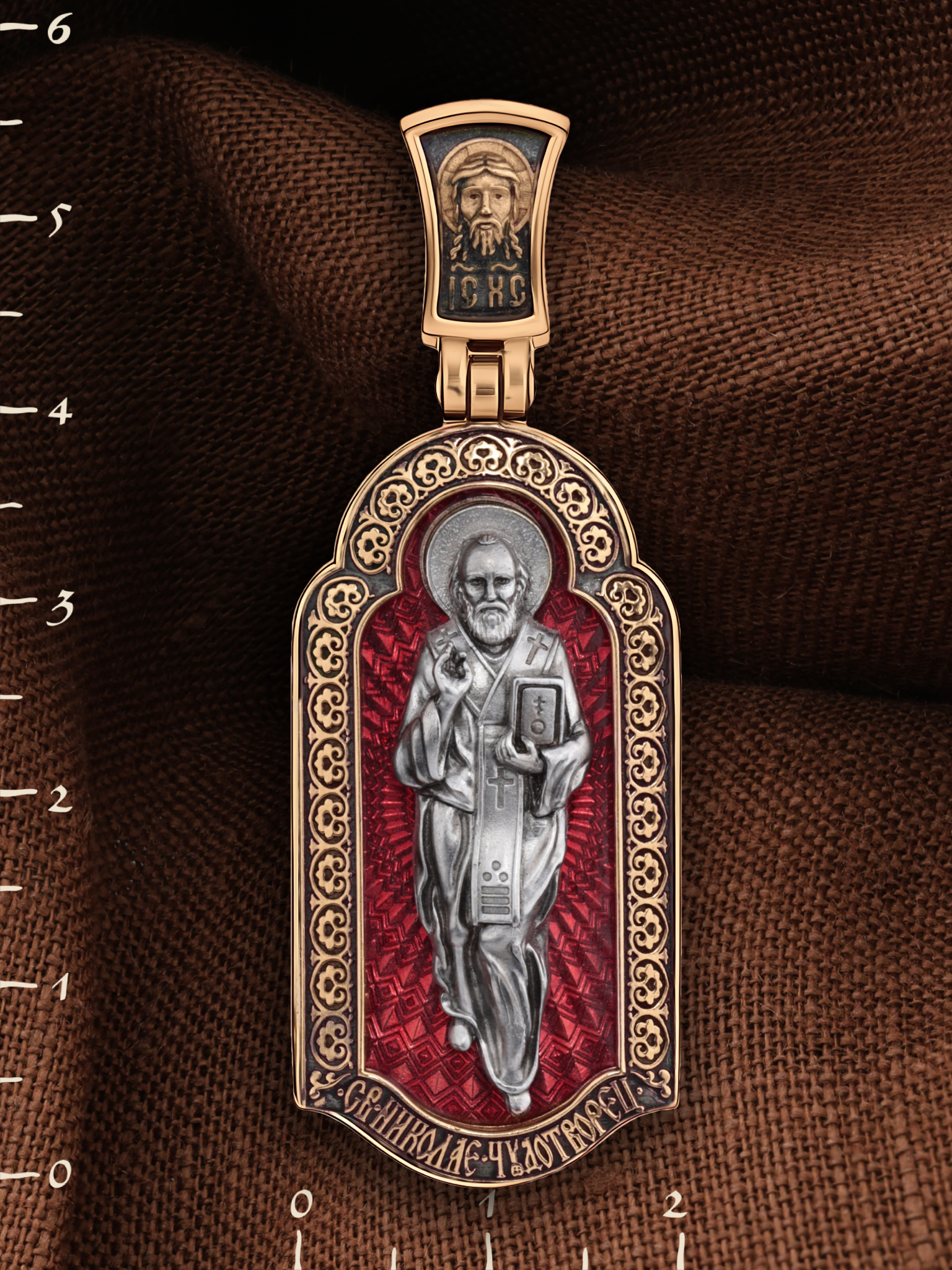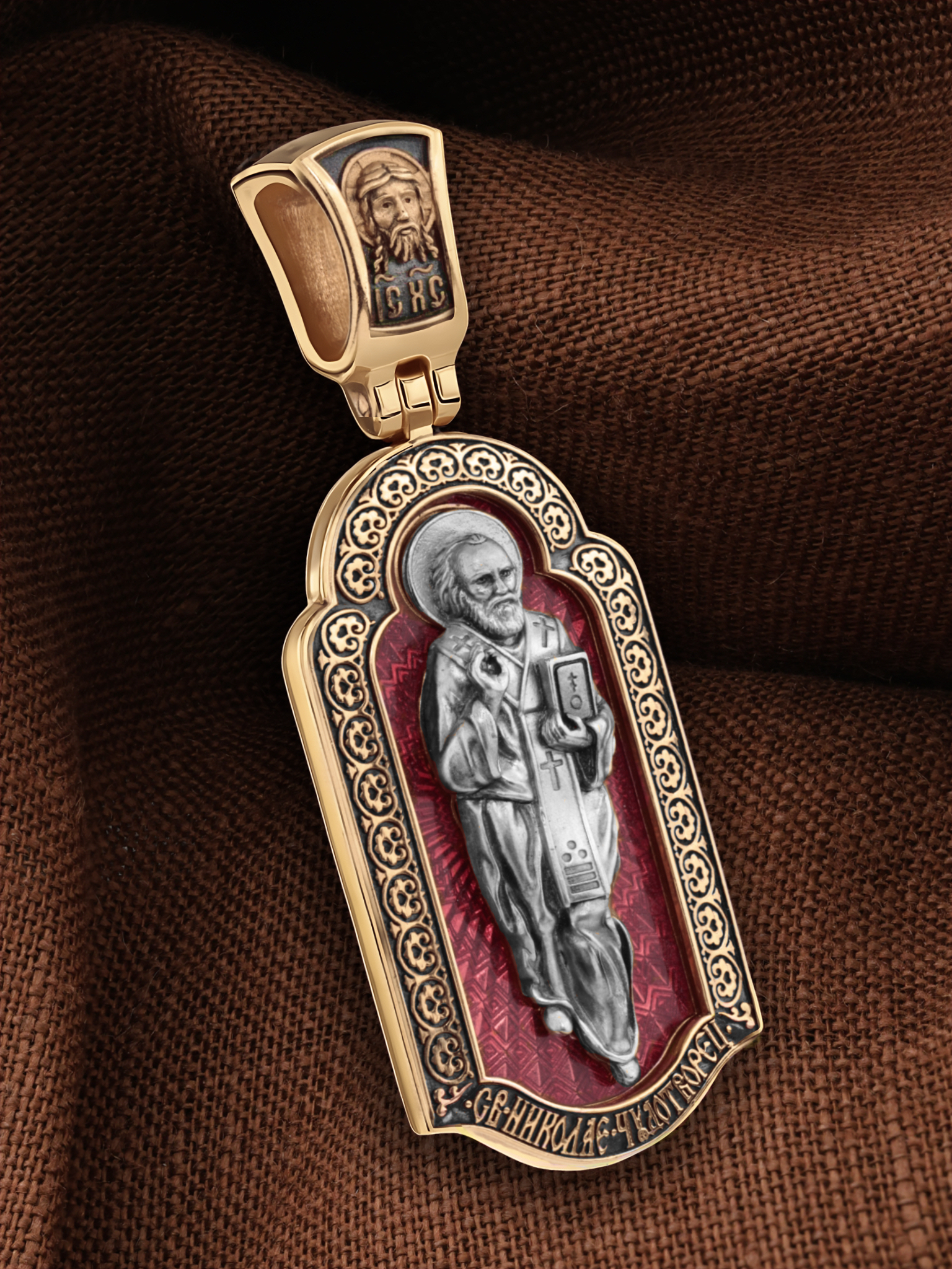 На лицевой стороне образка изображен Святитель Николай архиепископ Мир Ликийских, Чудотворец. Он является одним из самых почитаемых святых в православном мире. Избранник Божий Николай стал вершиной всех добродетелей. С кем из величайших праведников не сравнялся он образом духовной красоты, кому из них не последовал в своих деяниях и чудотворениях? Всеблаженный Николай был кроток, как Моисей, мужественен, как Давид, славен простотой нрава, как Иаков. Словно Ной, он спасал стадо Господне в новом ковчеге от потопа ересей. Вся жизнь святого Николая — это служение Богу. Много великих чудес сотворил на земле и на море великий Святитель Николай Угодник. Он укрощал штормы, спасал от потопления и выносил на сушу из глубины морской, освобождал из плена и приносил освобожденных домой, избавлял от уз и темницы, освобождал от смерти и подавал многим различные исцеления: слепым — прозрение, хромым — хождение, глухим — слух.