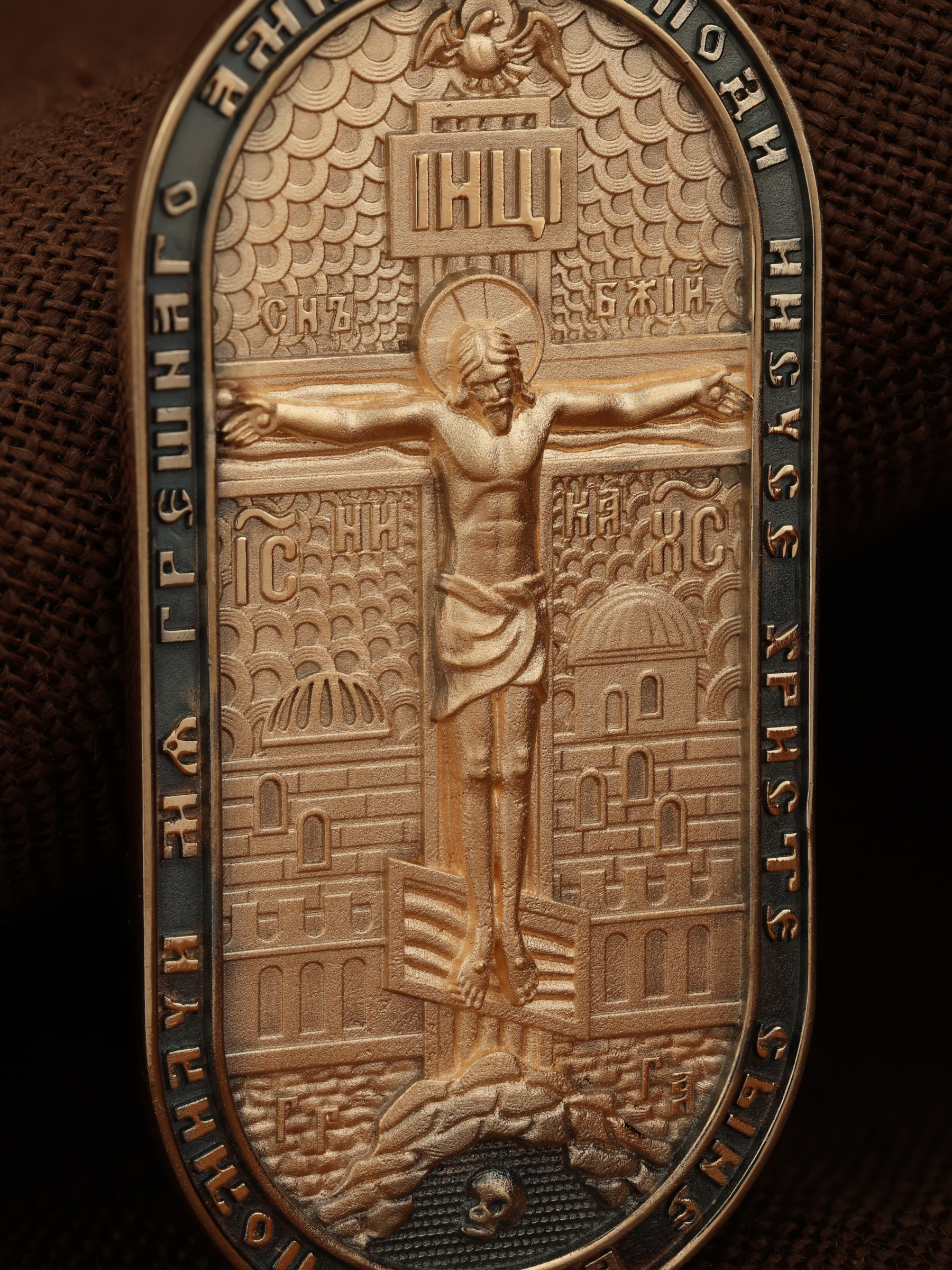Центральную часть лицевой стороны занимает Распятие Христа — образ жертвы, принесенной Господом за грехи людей. Именно ко Христу, сошедшему на землю ради нашего спасения, возносятся все молитвы. Рядом с Его образом помещены слова — «НИКА» (греч. — Победитель) и «СЫН БОЖИЙ». Эти слова характеризуют Господа как Великого Архиерея, победителя смерти. Также Распятие сопровождается надписями, олицетворяющими Христа — это святое имя Христа «IC» (Иисус) «ХС» (Христос). Верхняя перекладина символизирует собой табличку с надписью «IHЦI» — Иисус Назарянин Царь Иудейский. Возвышение, на котором стоит Крест, символизирует гору Голгофу, на которой произошло Распятие. У подножия Креста изображают прах Адама, обозначенный черепом. На кулонном кольце изображен шестикрылый Серафим — самый приближенный к Господу Ангел. По контуру образка написана молитва: «Господи Иисусе Христе, Сыне Божий, помилуй мя грешного. Аминь»