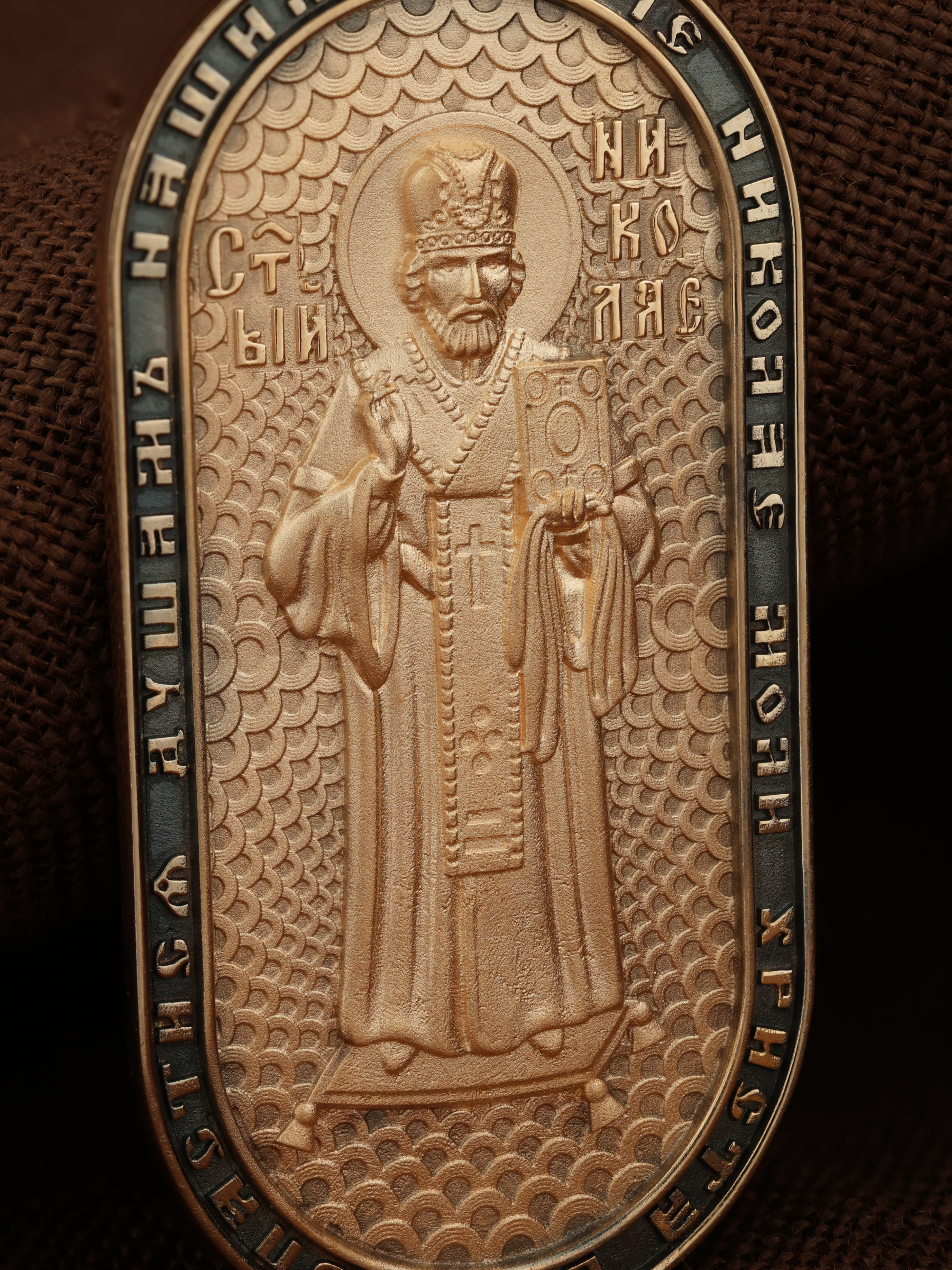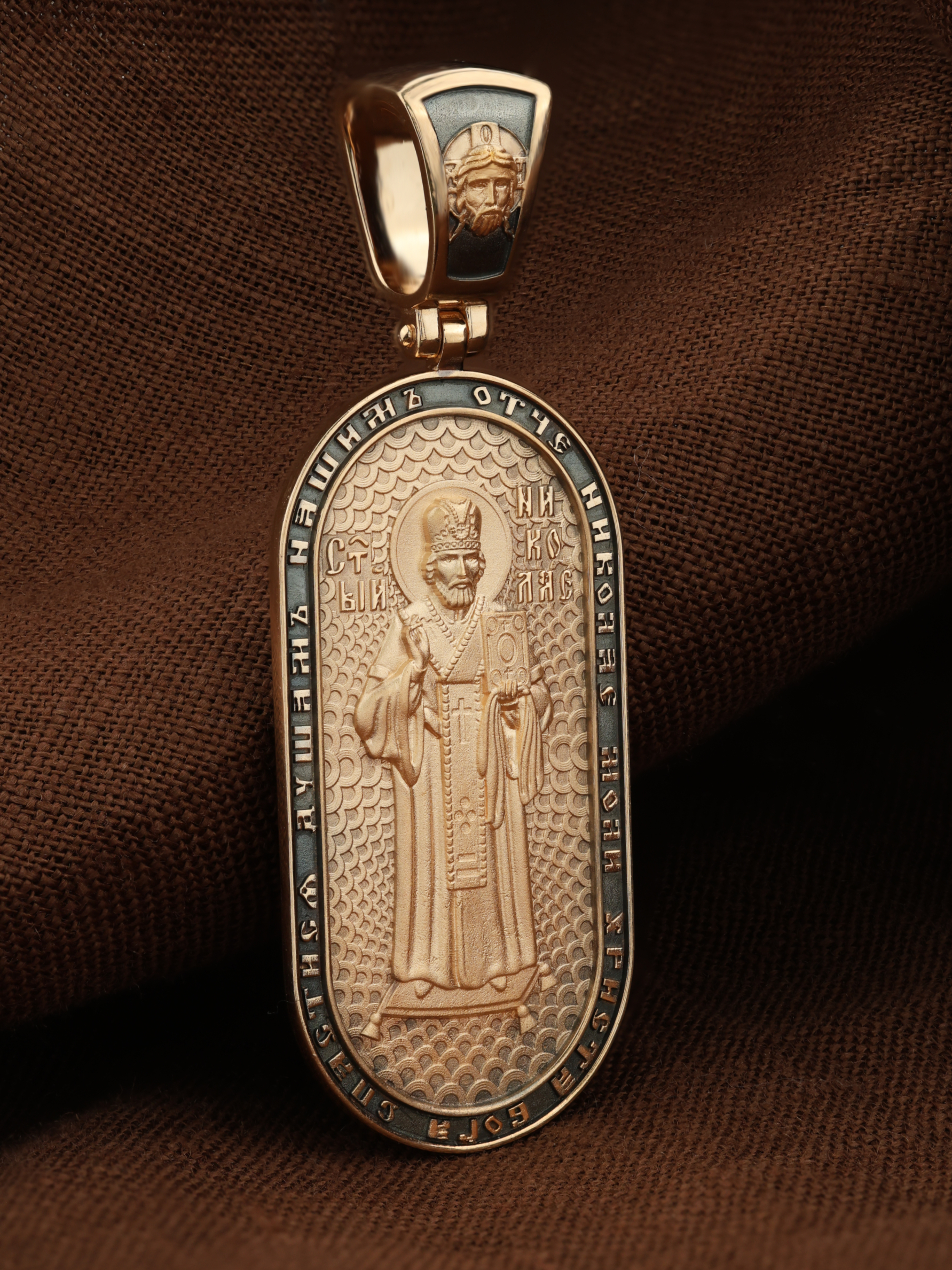 На оборотной стороне изображен Святой Николай Чудотворец, которого еще называют Николай Угодник — помощник в делах, покровитель учащихся, утешитель обиженных и нуждающихся, целитель самых страшных и тяжелых недугов, предстатель и молитвенник за людей перед Богом. Также Святитель Николай Чудотворец известен своими молитвами за путешественников, когда непрестанный ветер и бушующие волны утихают и корабль заходит в спокойную гавань. По контуру написана молитва: «Отче, Николай, моли Христа Бога спастися душам нашим». На кулонном кольце помещено изображение Спаса Нерукотворного.