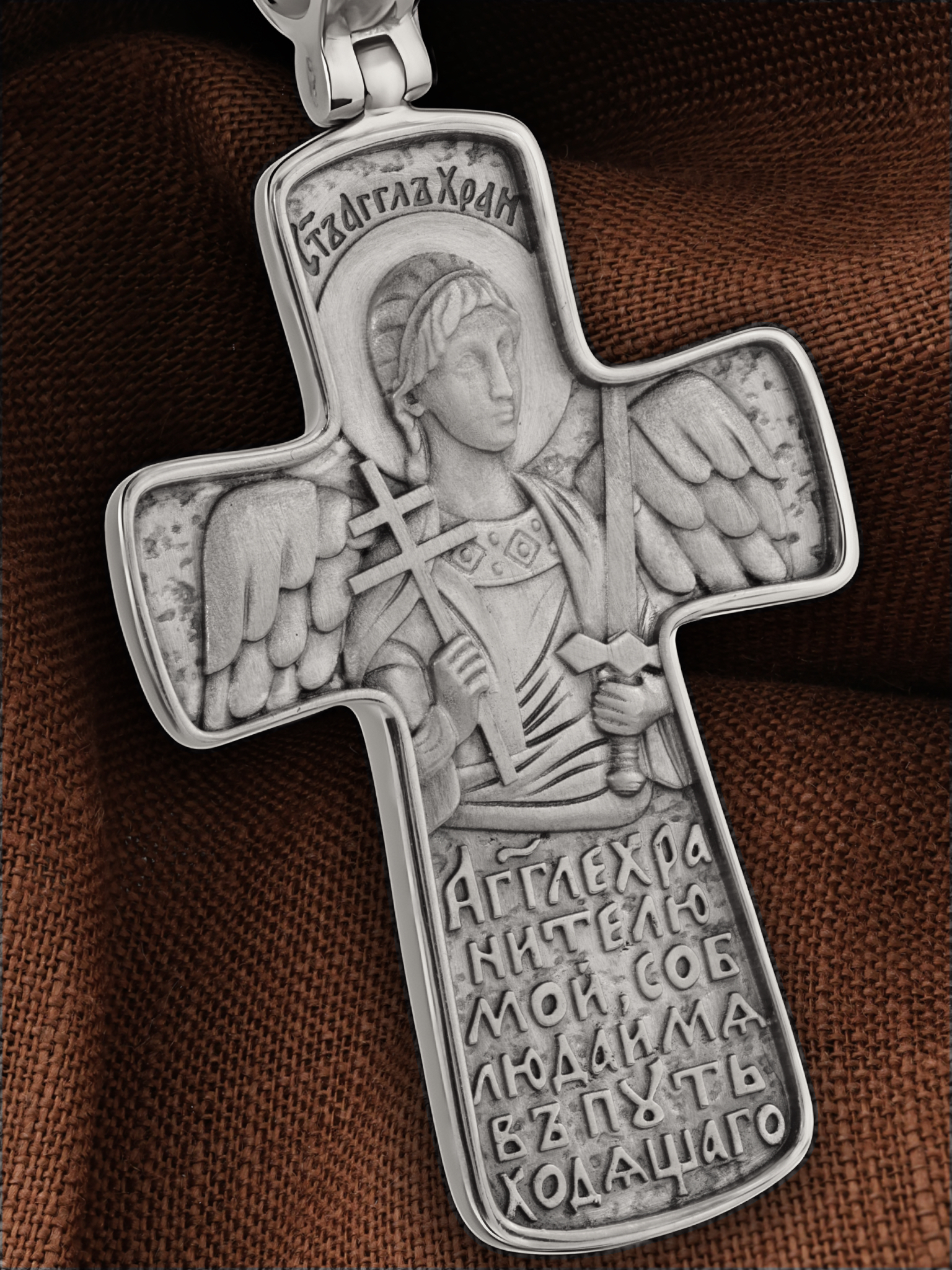 На оборотной стороне креста изображен Святой Ангел-Хранитель держащий в правой руке крест, а в левой — меч. Ангел-Хранитель — это Ангел приставляемый Богом к человеку при крещении для охраны и помощи в добрых делах. Он невидимо находится при человеке на протяжении всей его жизни, если человек сохраняет в себе любовь к Богу и истинную веру перед Ним. Ангел-Xранитель делают для нас все, что служит к истинному нашему благу и спасению. Невидимо пребывая при нас постоянно, он наставляет нас на все доброе и полезное, возносит наши молитвы к Богу, охраняют и защищают нас от врагов видимых и невидимых, ходатайствует за нас пред Богом. Ниже образа размещена молитва: «Ангеле-Хранителю мой, соблюдай мя в путь ходящего».