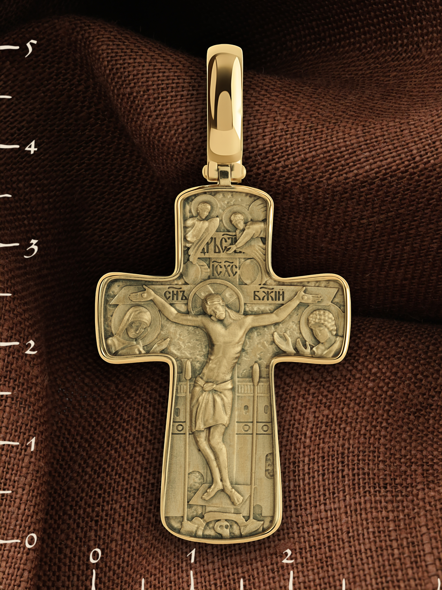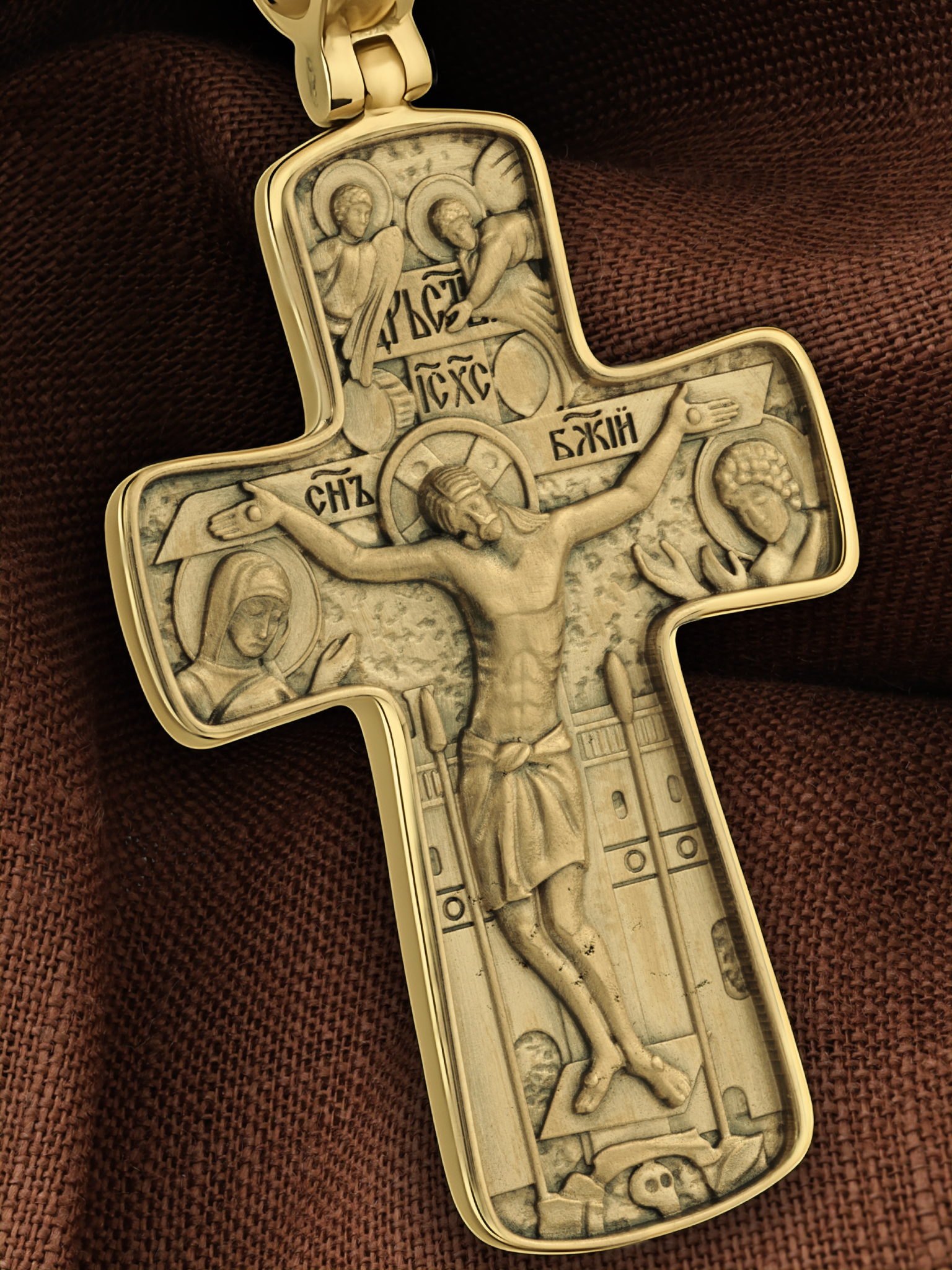 На лицевой стороне креста изображено Распятие Господа и Спасителя нашего Иисуса Христа. Крест- символ спасения и искупления рода человеческого, знамение победы над смертью и адом. Иисус Христос, как искупительная жертва освобождения человечества от власти греха, умер крестной смертью и в третий день воскрес. Господь сказал: кто хочет идти за Мною, отвергнись себя, и возьми крест свой, и следуй за Мною. (Мк. 8: 34). Над вершиной Распятия помещена надпись «Царь Славы». На верхней табличке, выше головы Иисуса, расположена надпись, составленная Понтием Пилатом — «IНЦI». Надпись «IС» « ХС» означает Иисус Христос и помещается на разных сторонах поперечной перекладины креста. Рядом расположена надпись «Сын Божий». Над Распятием изображены ангелы. Слева от Распятия изображена Пресвятая Богородица, справа — апостол и евангелист Иоанн Богослов, один из ближайших учеников Иисуса Христа. Крест стоит на горе камней, символизирующих Голгофу. В ее основании различается череп — это голова Адама. Вдоль креста изображены копие сотника Лонгина и трость с губкой.