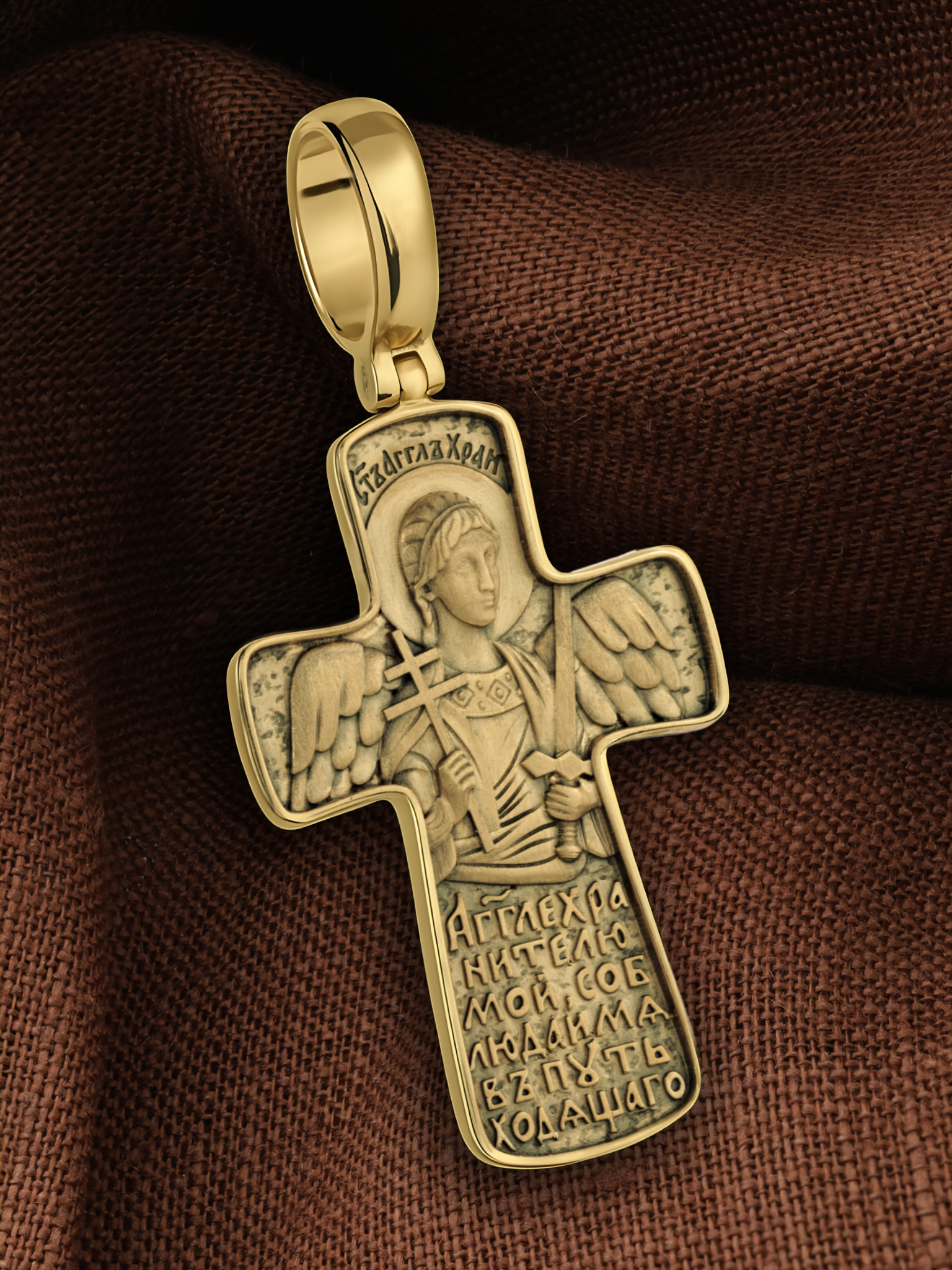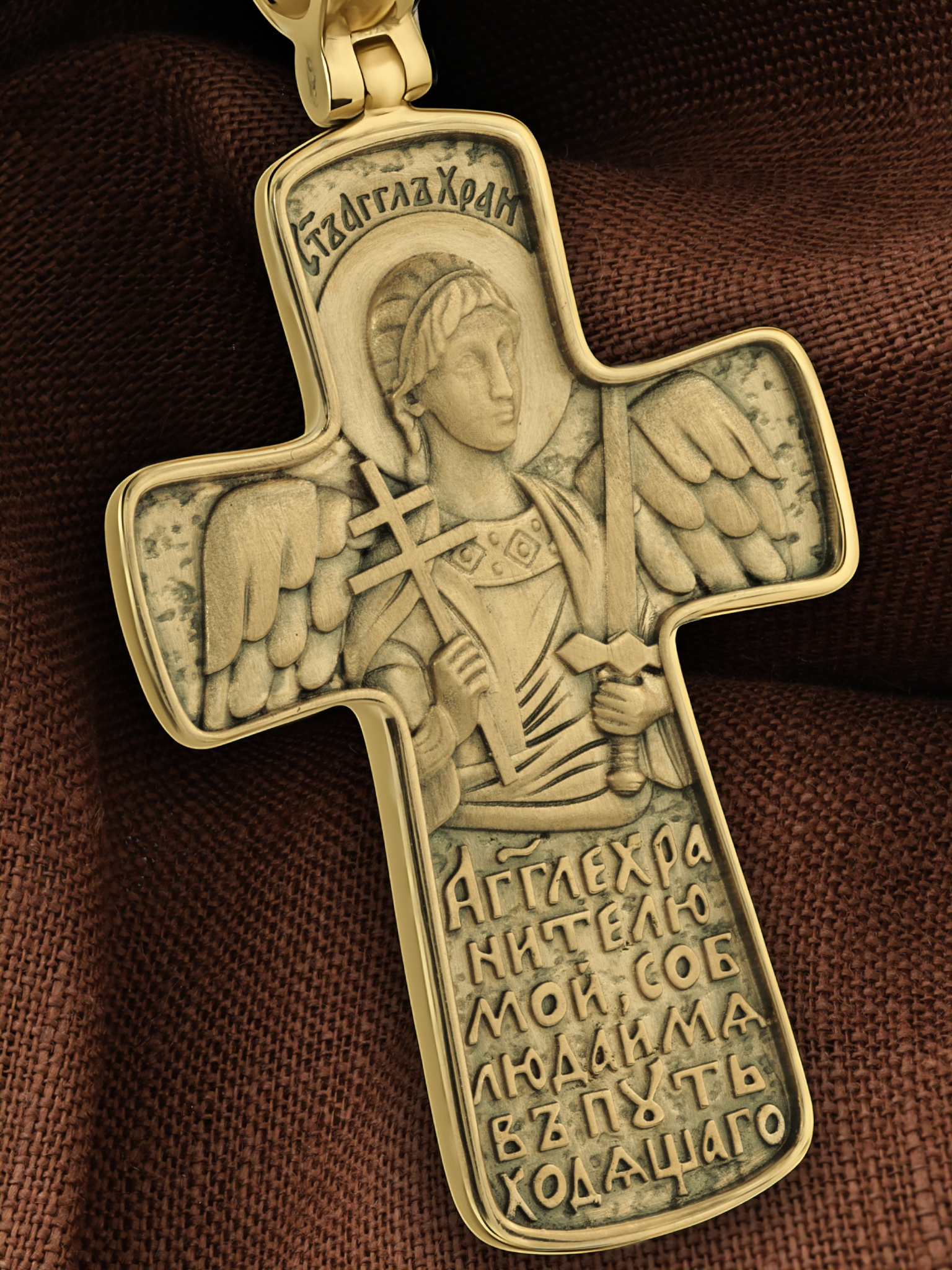 На оборотной стороне креста изображен Святой Ангел-Хранитель держащий в правой руке крест, а в левой — меч. Ангел-Хранитель — это Ангел приставляемый Богом к человеку при крещении для охраны и помощи в добрых делах. Он невидимо находится при человеке на протяжении всей его жизни, если человек сохраняет в себе любовь к Богу и истинную веру перед Ним. Ангел-Xранитель делают для нас все, что служит к истинному нашему благу и спасению. Невидимо пребывая при нас постоянно, он наставляет нас на все доброе и полезное, возносит наши молитвы к Богу, охраняют и защищают нас от врагов видимых и невидимых, ходатайствует за нас пред Богом. Ниже образа размещена молитва: «Ангеле-Хранителю мой, соблюдай мя в путь ходящего».