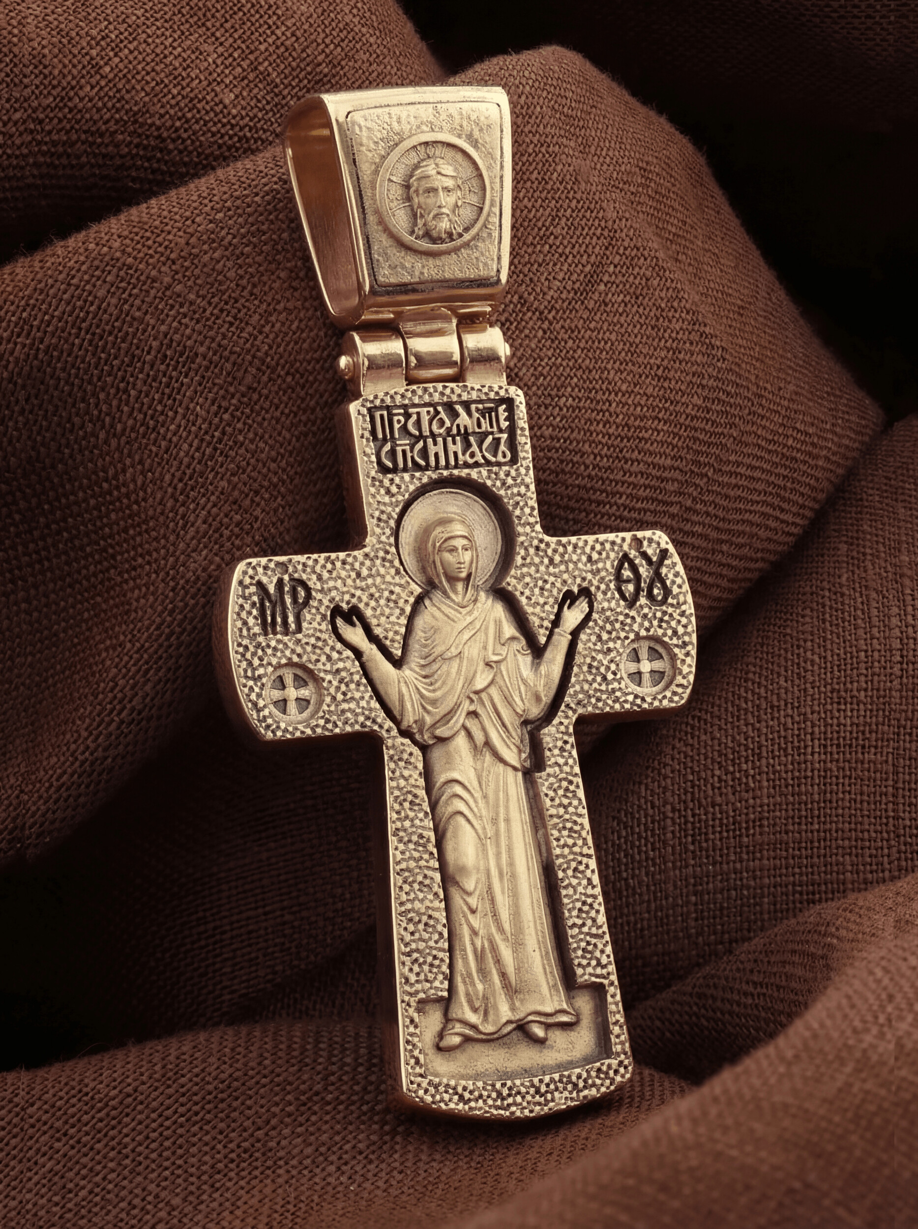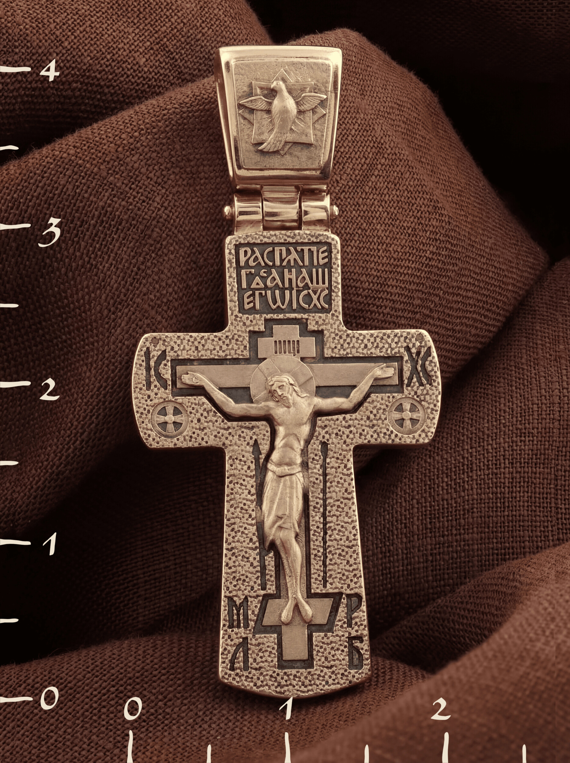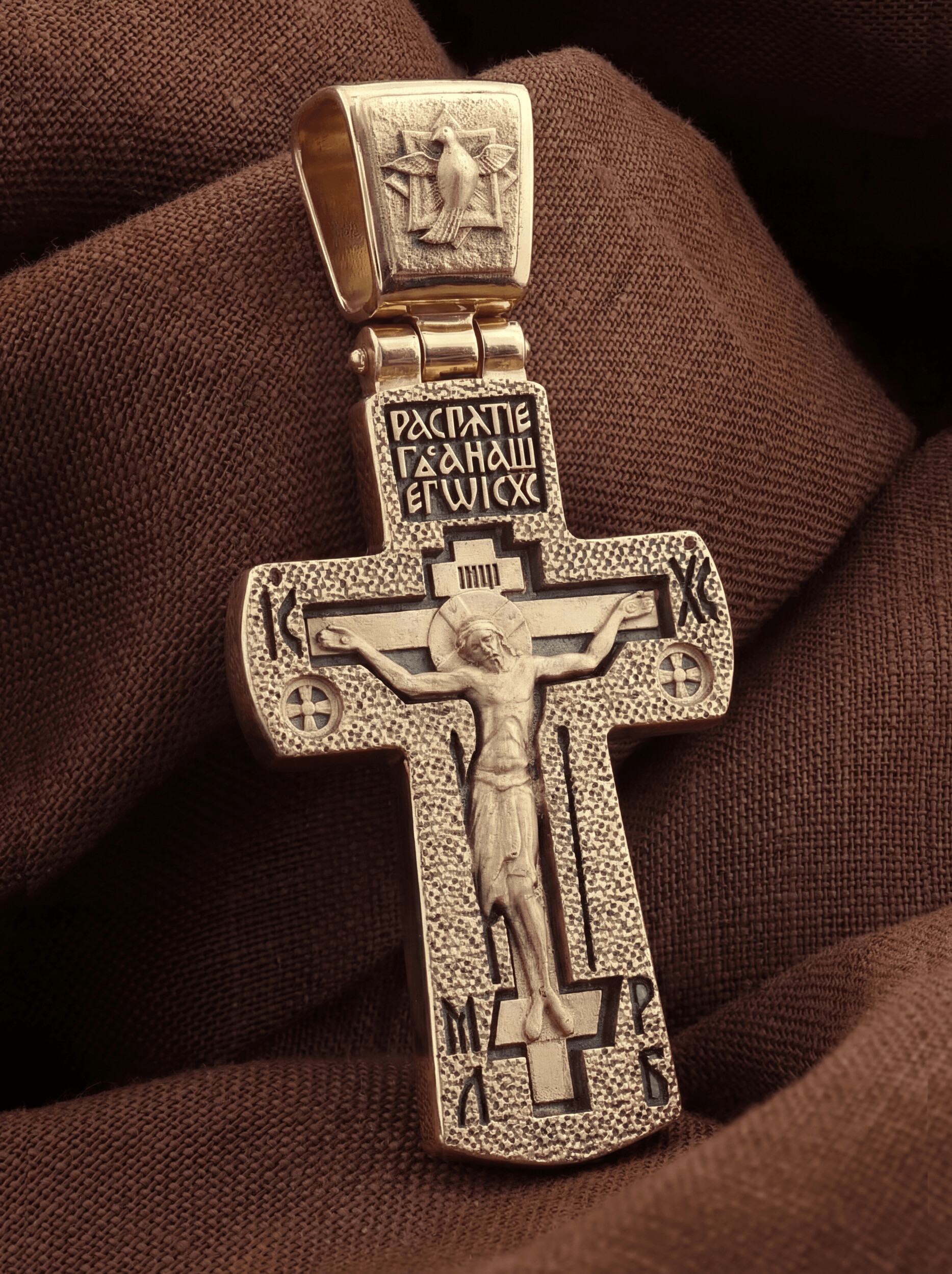 На лицевой стороне креста изображено Распятие Иисуса Христа. Господь представлен свободно покоящимся на кресте с простертыми руками и как бы обнимающим всю Вселенную. Он — Спаситель, искупивший грехи мира, «поправший смертию смерть» и призывающий к Себе «все концы земли». Верхняя перекладина символизирует титло — табличку, на которой, согласно Евангелию, было начертано: Иисус Назорей Царь Иудейский (IНЦI). Также Распятие сопровождается надписями, олицетворяющими Христа. Это святое имя Христа «IC» (Иисус) «ХС» (Христос). Возвышение, на котором стоит Крест, символизирует гору Голгофу, на которой произошло Распятие. У подножия пишутся четыре буквы «МЛ» и «РБ» — «Место Лобное» и «Рай Бысть».