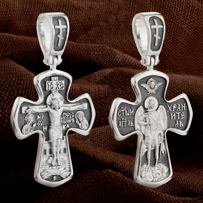 На оборотной стороне креста изображен Святой Ангел-Хранитель держащего в правой руке крест, а в левой — мечь. Ангел-Хранитель — это Ангел приставляемый Богом к человеку при крещении для охраны и помощи в добрых делах. Он невидимо находится при человеке на протяжении всей его жизни, если человек сохраняет в себе любовь к Богу и истинную веру перед Ним. Ангел-Xранитель делают для нас все, что служит к истинному нашему благу и спасению. Невидимо пребывая при нас постоянно, он, руководствуя нас ко спасению, не только по нашему желанию таинственно наставляет нас на все доброе и полезное, не только возносит наши молитвы к Богу, но еще и сам от себя охраняют и защищают нас от врагов видимых и невидимых и ходатайствует за нас пред Богом. Одного лишь каждому из нас он желает — спасения души; к этому он направляет все свои заботы. Над образом помещен Серафим.