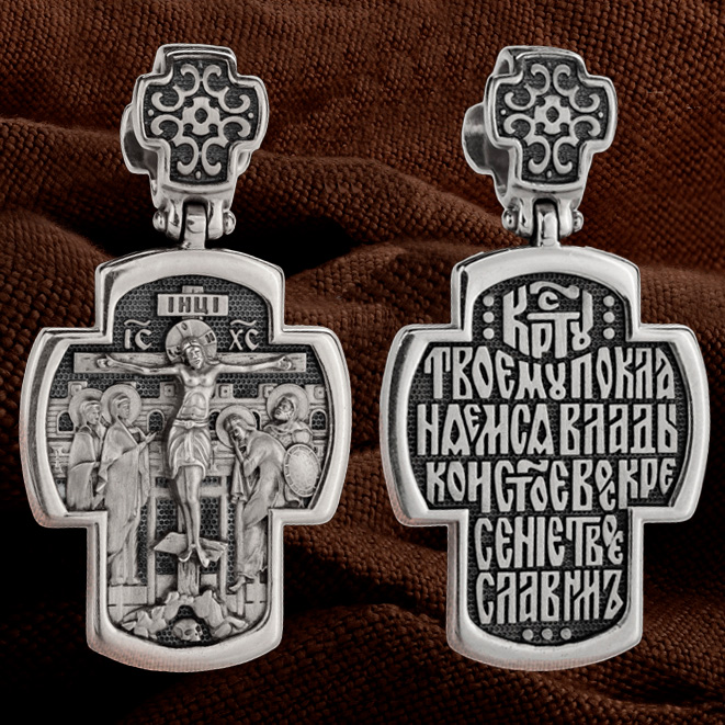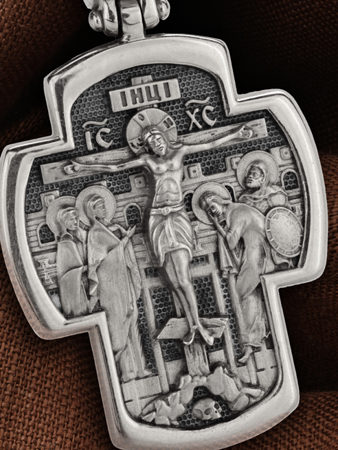 На лицевой стороне креста изображено Распятие Господа и Спасителя нашего Иисуса Христа. Своими крестными страданиями Господь смыл наши грехи, покрыл наш долг перед Богом или, на языке Писания, нас «искупил». В Голгофе сокрыта непостижимая тайна бесконечной правды и любви Бога. Крест стал символом победы добра над злом, жизни над смертью, напоминанием бесконечной Божьей любви, предметом радости. Воплотившийся Сын Божий Своею кровью освятил крест и сделал его проводником Своей благодати, источником освящения верующих. На верхней табличке, выше головы Иисуса, расположена надпись, составленная Понтием Пилатом — «IНЦI». Она означает «Иисус Назорей, Царь Иудейский». Ниже перекладины написано сокращенно имя Спасителя «IC» «XC» — Иисус Христос. Крест стоит на горе камней, символизирующих Голгофу. Под подножием Креста изображена покоящаяся голова (череп) Адама. Слева от Распятия стоят оплакивающие Господа Пресвятая Богородица и святая мироносица Мария Клеопова. Справа — апостол и евангелист Иоанн Богослов, один из ближайших учеников Иисуса Христа и сотник Лонгин. По преданию, увидя, что они горько плачут, Иисус сказал Матери Своей: «Жено! Се сын Твой!» Потом сказал ученику Иоанну: «Се мати твоя». С этого времени Иоанн взял Матерь Божию к себе, и Она жила в его доме до самой смерти.