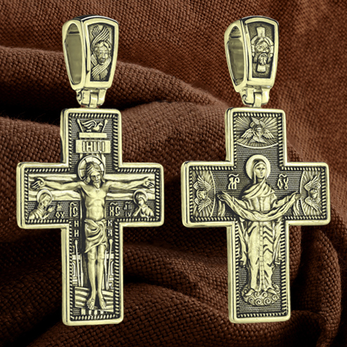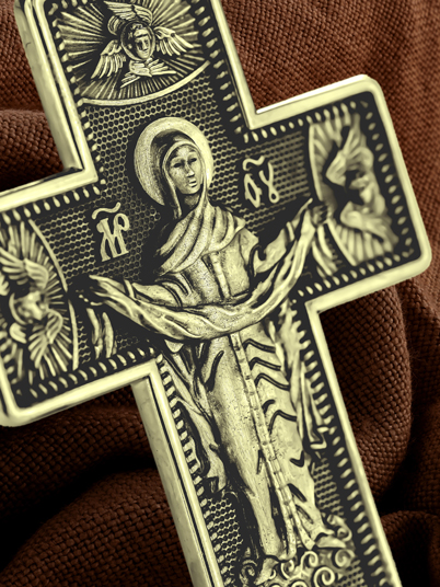 На обороте креста, в окружении крылатых Серафимов, изображена икона Покрова Пресвятой Богородицы. Праздник Покрова Божией Матери является воспоминанием чуда, которое произошло во Влахнернской церкви 1 (14) октября 910 года: Пресвятая Богородица явилась верующим над алтарем храма и распростерла над ними Свое покрывало. В этот день Божья Матерь открыла людям, что Она является Ходатаицей за них перед Богом. Богородица простирает Свой молитвенный покров над всеми православными христианами и умоляет Сына Своего о даровании вечного спасения каждому человеку.