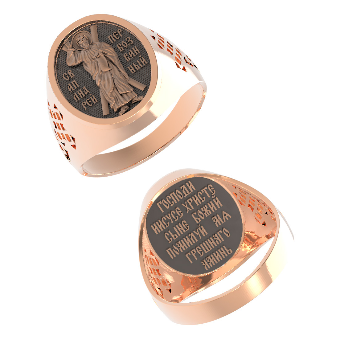 На лицевой стороне кольца помещен образ святого апостола Андрея Первозванного. Позади изображен Крест, на котором он был распят. Святой апостол Андрей Первозванный первым из апостолов последовал за Христом, а затем привел к нему своего родного брата — святого апостола Петра (Ин.1:35−42). С юности будущий апостол, который был родом из Вифсаиды, всей душой обратился к Богу. Он не вступил в брак и весте со своим братом занимался рыболовством. Когда над Израилем прогремел глас святого пророка, Предтечи и Крестителя Господня Иоанна, святой Андрей стал его ближайшим учеником. Святой Иоанн Креститель сам направил двух своих учеников, будущих апостолов Андрея Первозванного и Иоанна Богослова, ко Христу, указав, что Он есть Агнец Божий. После Сошествия Святого Духа на апостолов святой Андрей отправился с проповедью Слова Божия в восточные страны. Прошел Малую Азию, Фракию, Македонию, дошел до Дуная, прошел побережье Черного моря, Крым, Причерноморье и по Днепру поднялся до места, где стоит теперь город Киев. Апостол дошел до поселений славян, где был основан Новгород. Отсюда апостол прошел через земли варягов в Рим для проповеди и вновь вернулся во Фракию, где в небольшом селении Византии, будущем могучем Константинополе, основал христианскую Церковь. В греческом городе Патры по приказу правителя-язычника Эгеата Андрей Первозванный был распят на Кресте, но в течение трёх последующих дней оставался живым и поучал людей. Только после молитвы к Богу о том, чтобы он забрал его к себе, Андрей Первозванный принял мученическую смерть. Имя святого апостола Андрея связывает мать — Церковь Константинопольскую с ее дочерью — Русской Церковью.