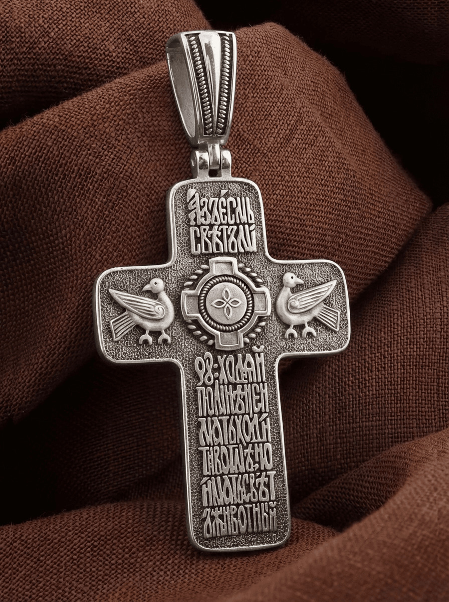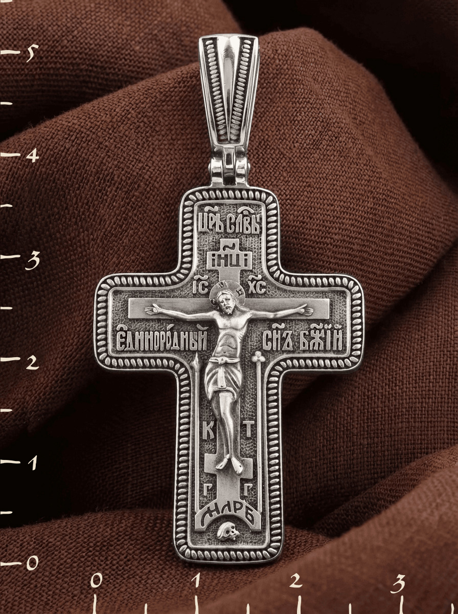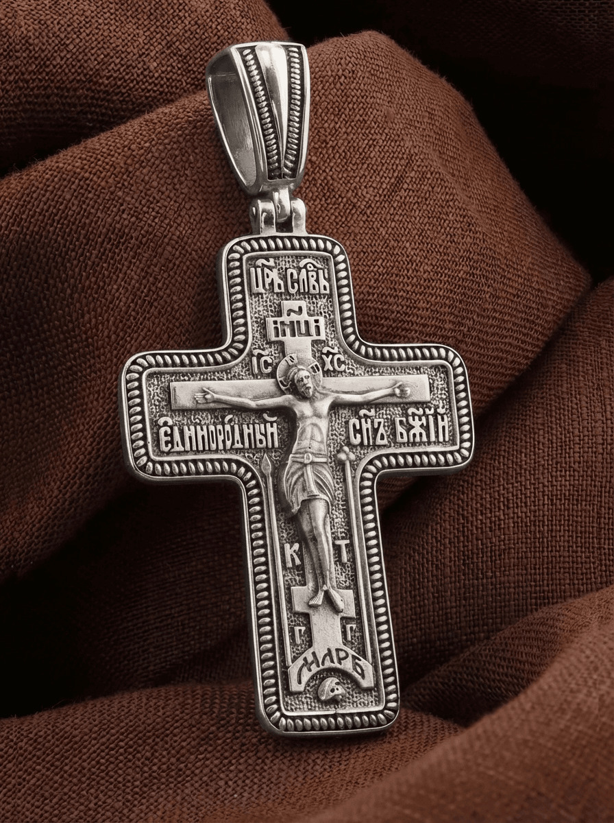 На лицевой стороне креста изображено Распятие, потому что это орудие казни Иисус Христос сделал орудием победы над грехом и смертью. Своими страданиями Он искупил грехи человечества, умерев и сошествовав во ад, победил сатану, освободил души праведников от вечной смерти и открыл им небесные врата рая. Жертва Христа сделала возможным спасение для каждого человека. На православном кресте Христос не умирает, а свободно простирает руки, ладони Иисуса открыты, будто он хочет обнять все человечество, даря им свою любовь и открывая путь к вечной жизни.