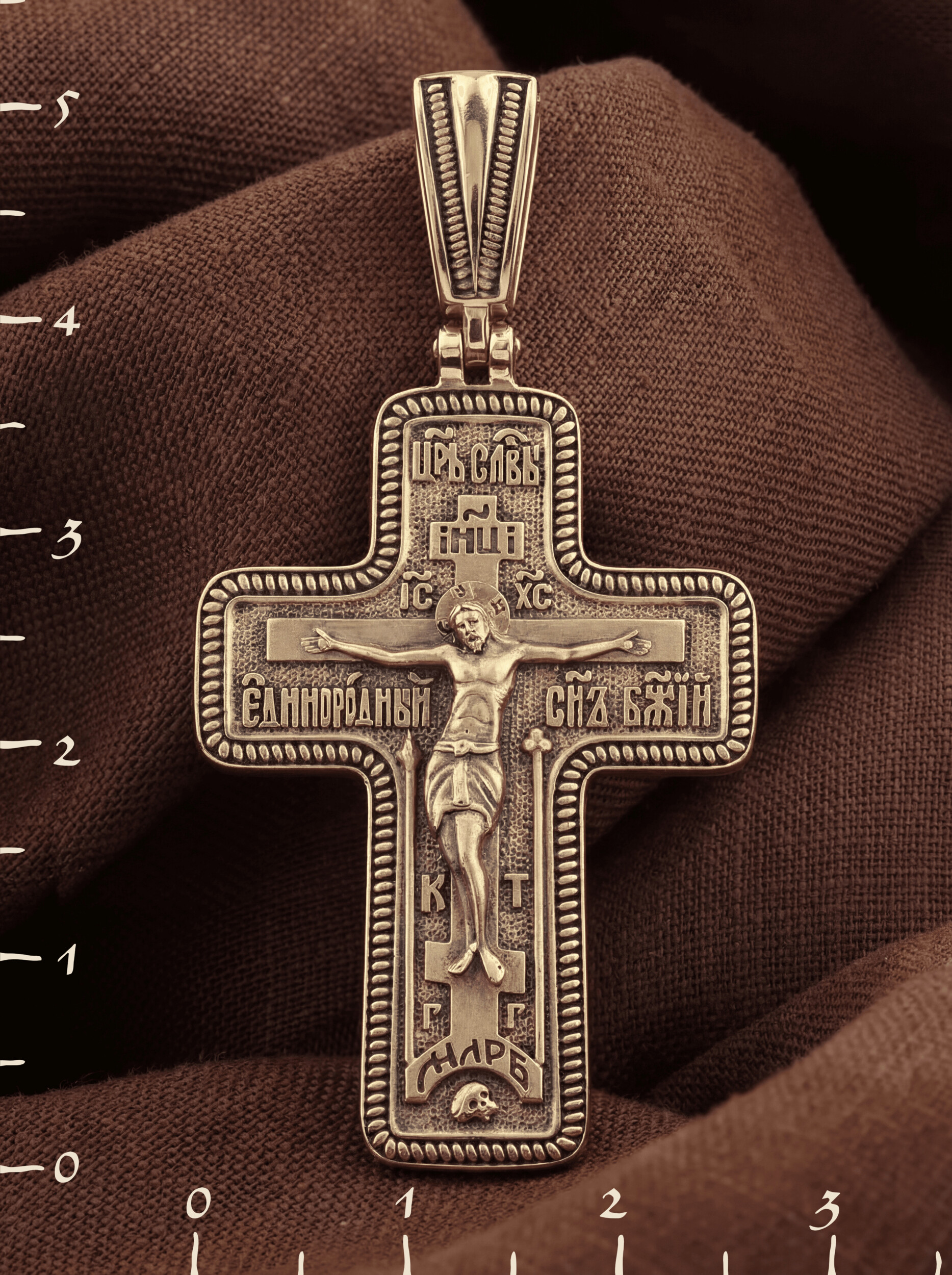 На лицевой стороне креста изображено Распятие, потому что это орудие казни Иисус Христос сделал орудием победы над грехом и смертью. Своими страданиями Он искупил грехи человечества, умерев и сошествовав во ад, победил сатану, освободил души праведников от вечной смерти и открыл им небесные врата рая. Жертва Христа сделала возможным спасение для каждого человека. На православном кресте Христос не умирает, а свободно простирает руки, ладони Иисуса открыты, будто он хочет обнять все человечество, даря им свою любовь и открывая путь к вечной жизни.