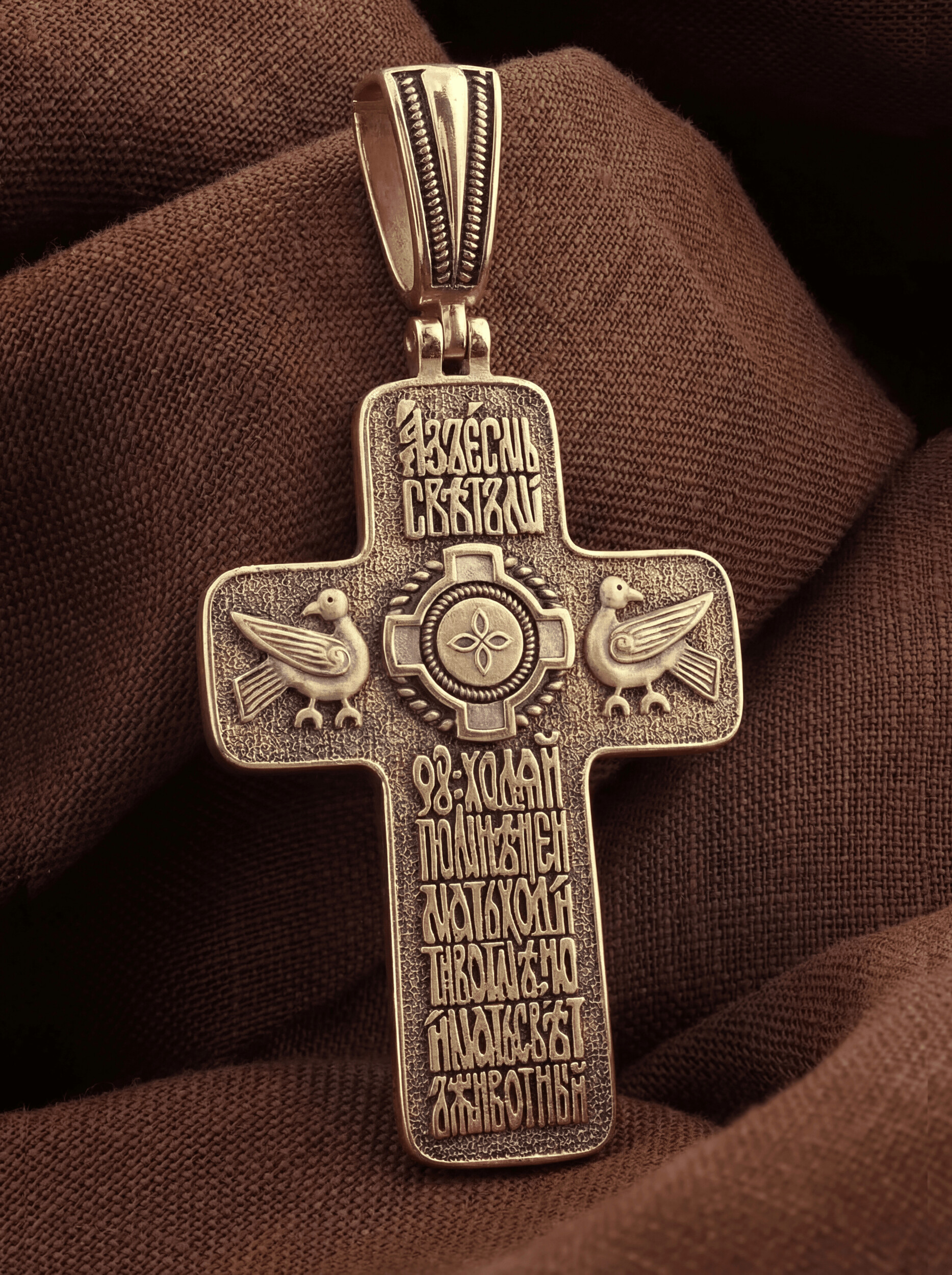 На оборотной стороне креста написаны слова из Евангелия: «Я свет миру; кто последует за Мною, тот не будет ходить во тьме, но будет иметь свет жизни». Эти слова призваны напоминать нам, что главной задачей христианина является собирание света Божественной благодати в своем сердце.