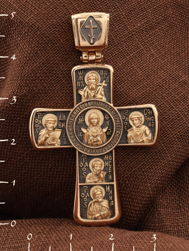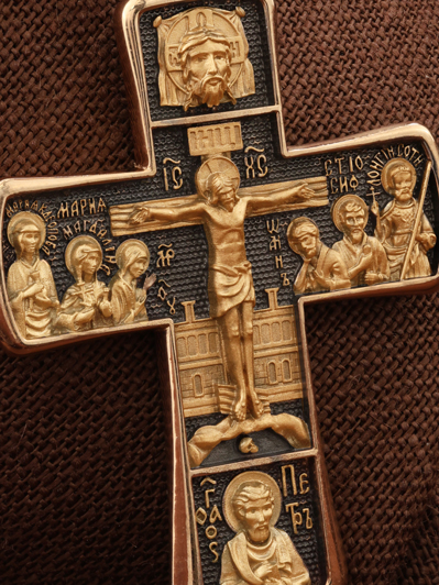 На лицевой стороне креста изображено Распятие Господа Иисуса Христа с предстоящими Ему святыми, которые, по преданию, находились у Креста Господа во время Его казни. Слева — Пресвятая Богородица и жены-мироносицы — равноапостольная Мария Магдалина и святая Мария Клеопова, справа — апостол Иоанн Богослов, прав. Иосиф Аримофейский и мч. Лонгин Сотник.