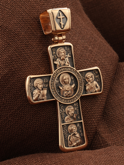 Центральную часть оборота креста украшает икона Божией Матери «Знамение». Вокруг Ее образа написана молитва: «Ныне к Тебе прибегаю, Пресвятая Дева, спаси мя мольбами Твоими».