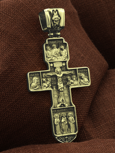 На концах горизонтальной балки креста помещены образы вселенских святителей и творцов литургии Василия Великого и Иоанна Златоуста. В кулонном кольце изображены райские врата с их стражем — Херувимом. Врата, которые открылись благодаря крестной жертве Христа.