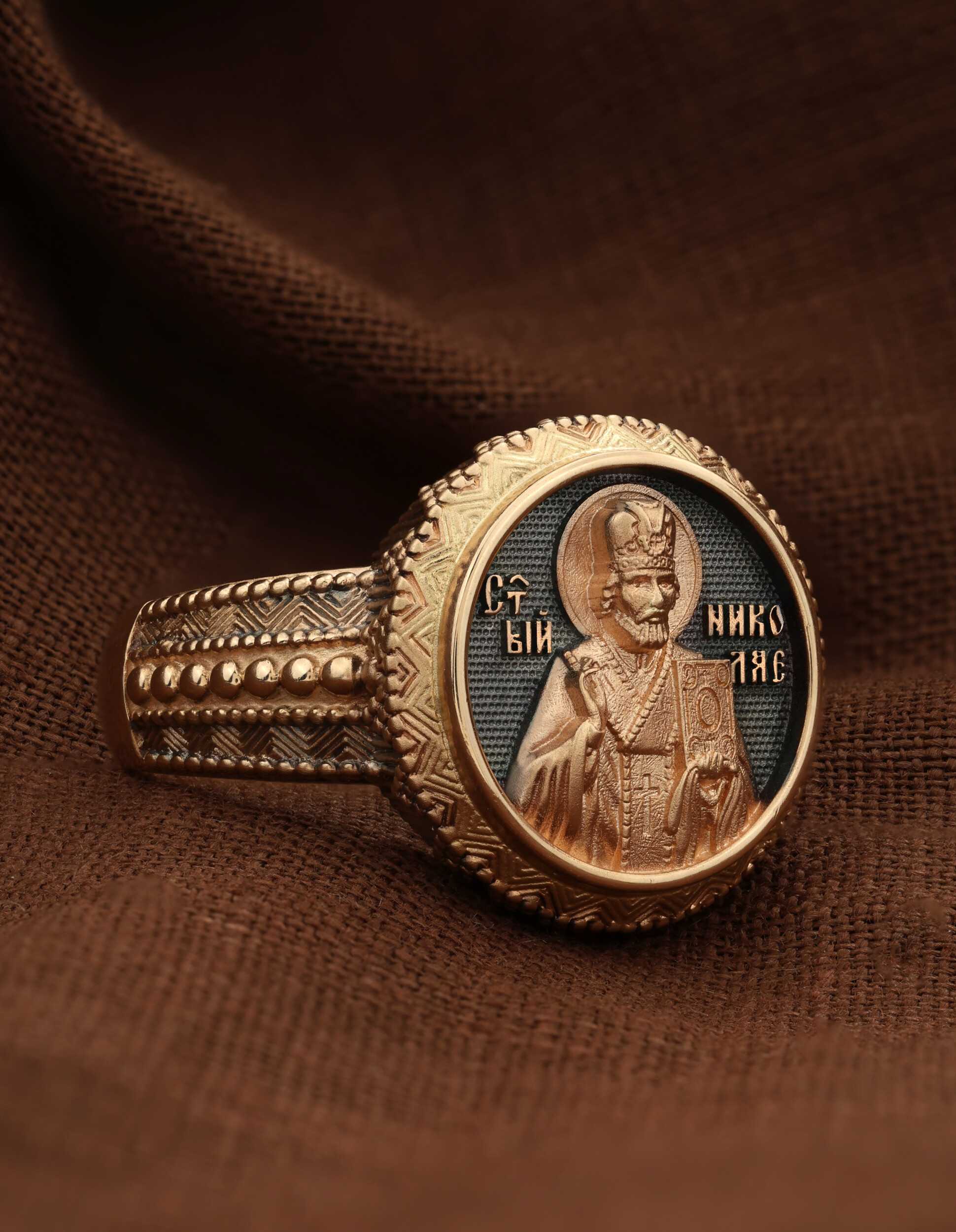 С внутренней стороны кольца выгравирована молитва: «Отче Николае, моли Христа Бога спастися душам нашим».