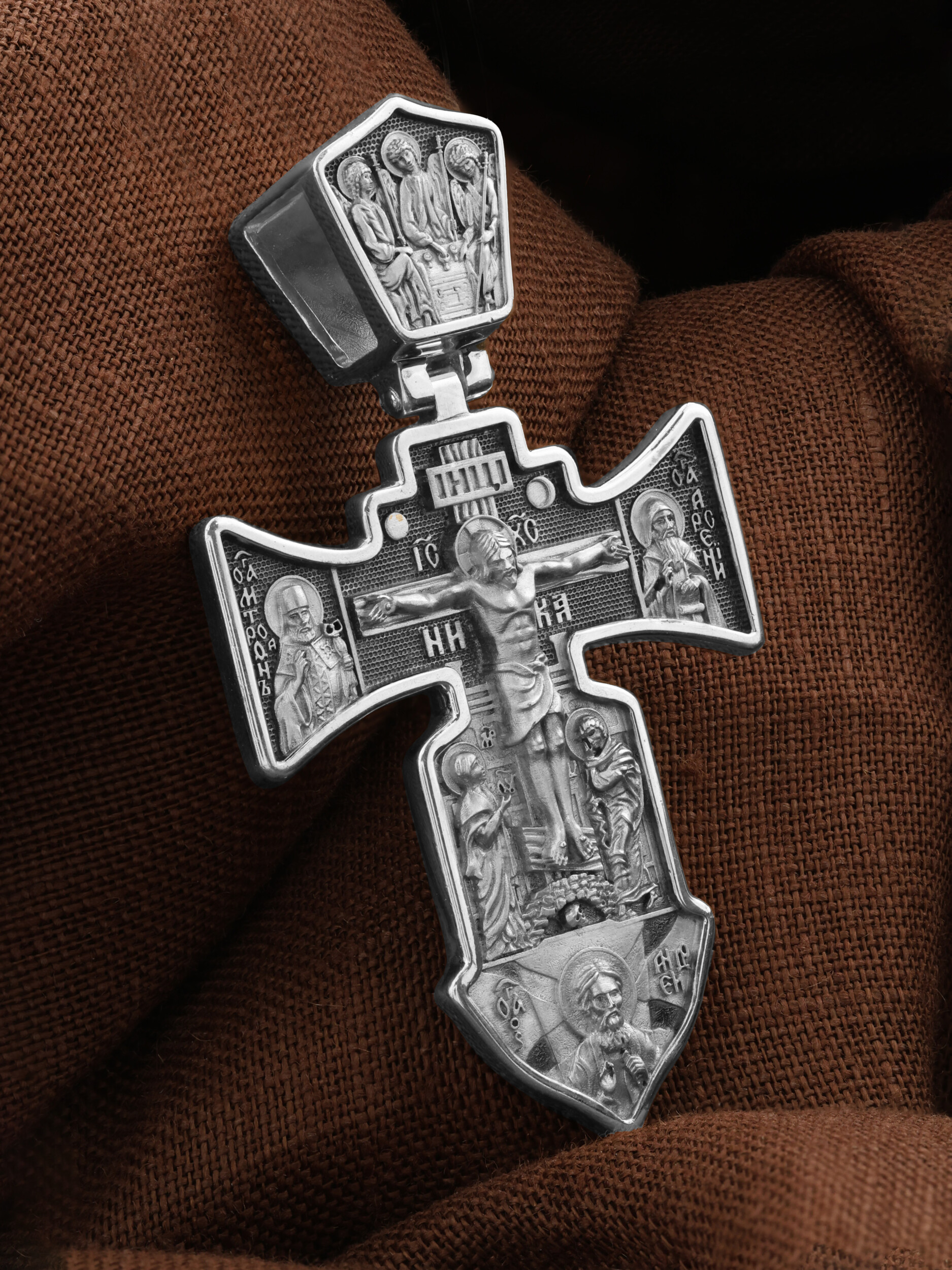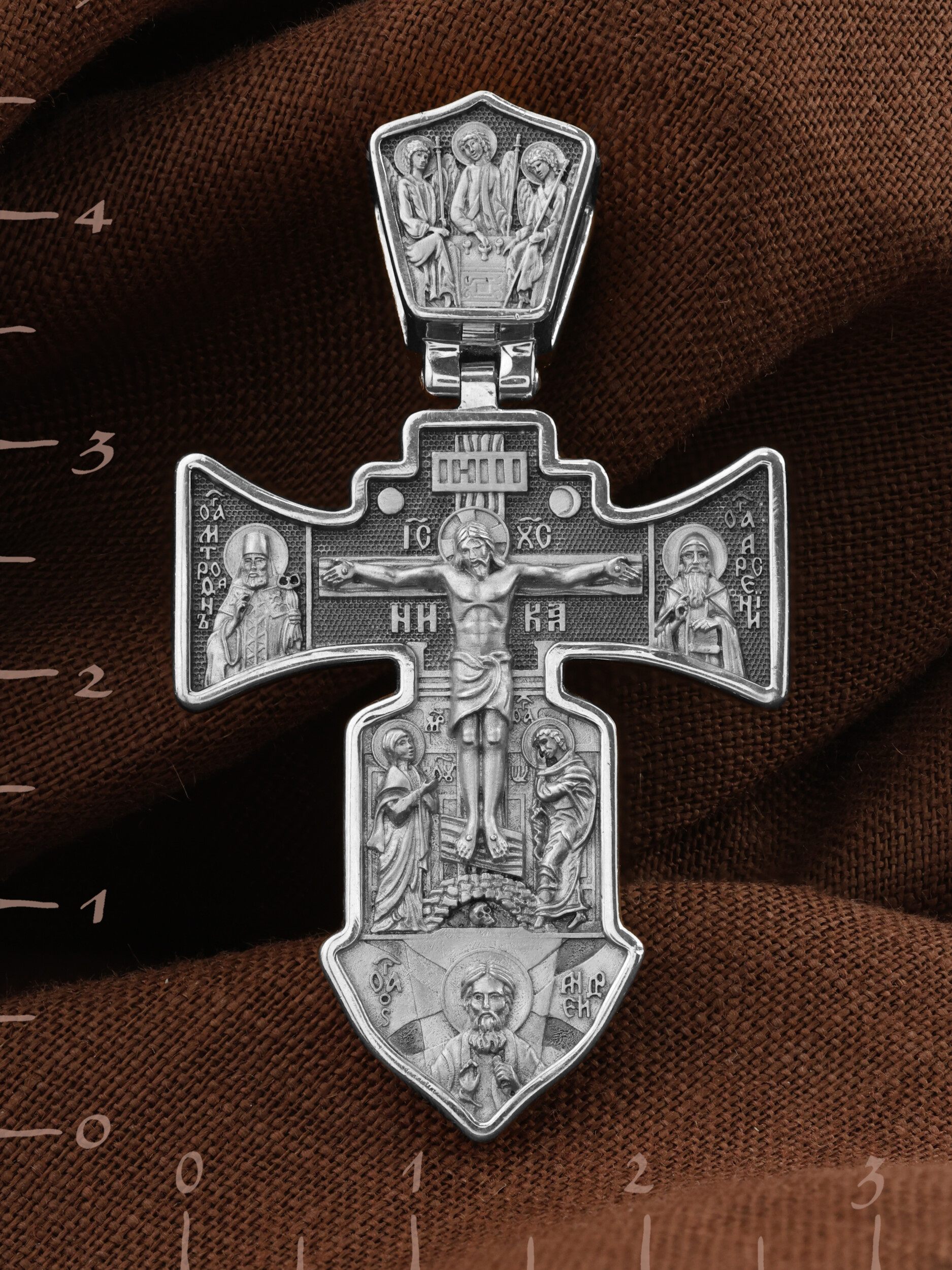 На лицевой стороне креста изображено Распятие Господа Иисуса Христа.