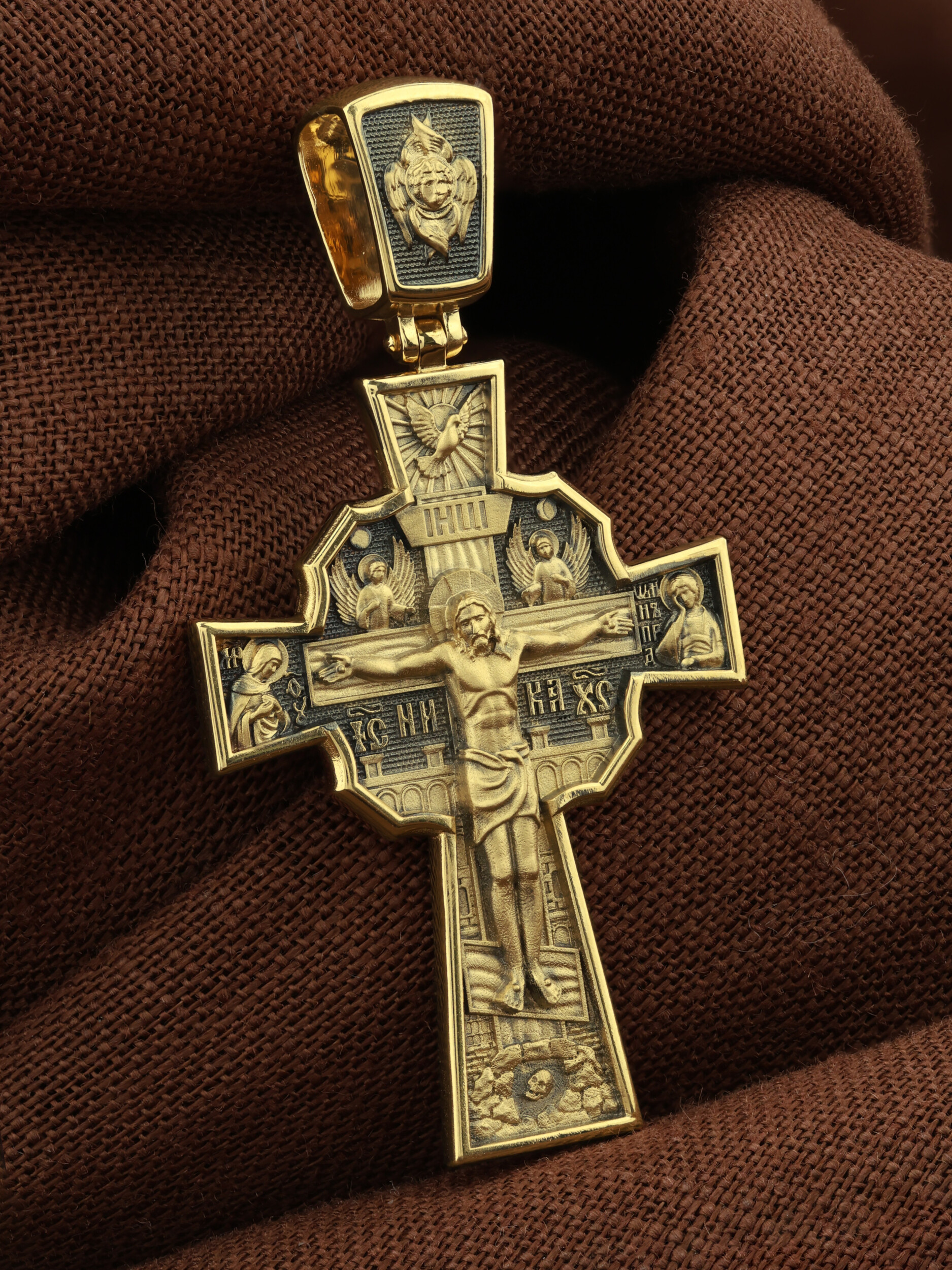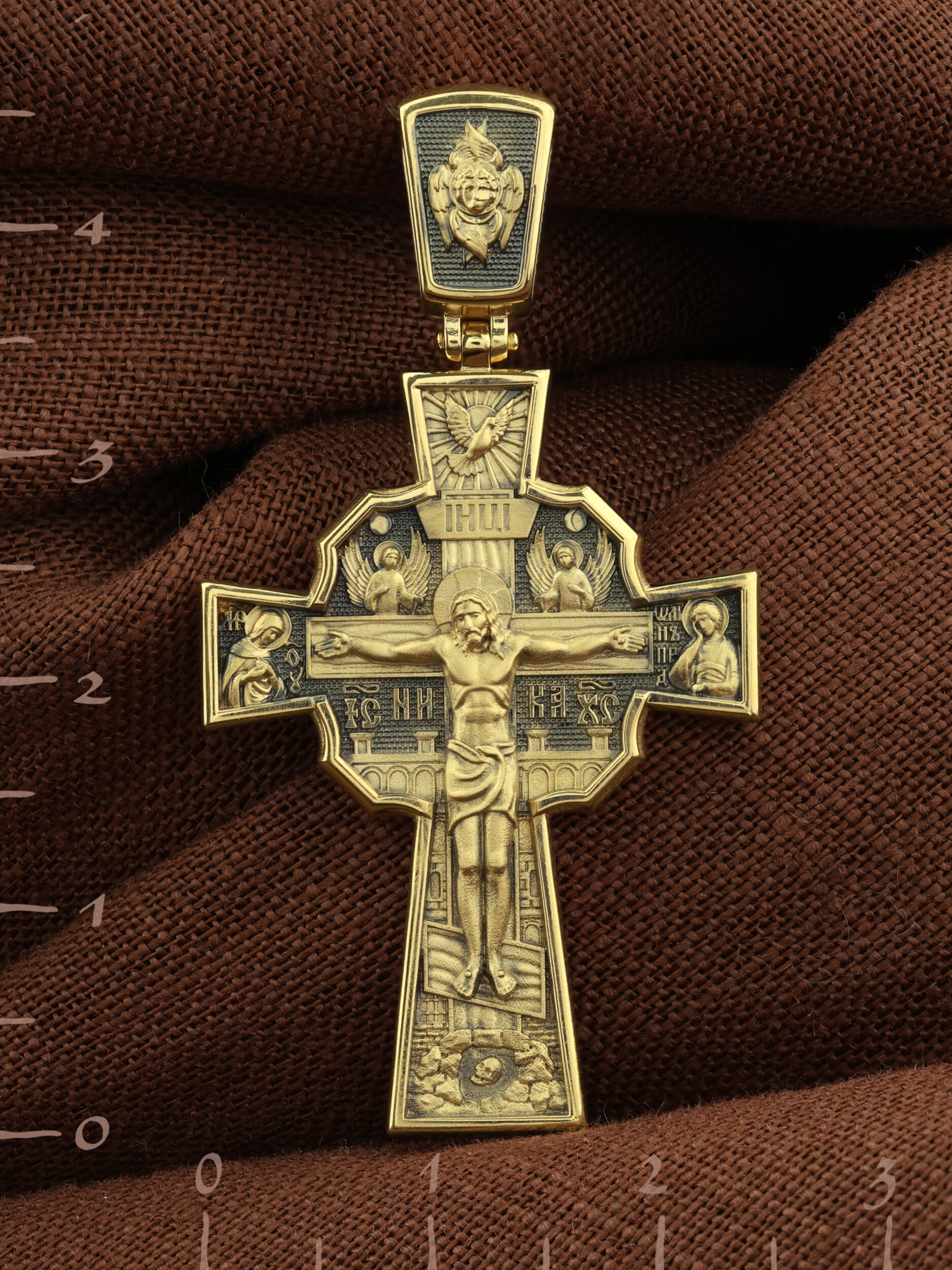 На лицевой стороне креста изображено Распятие Господа и Спасителя нашего Иисуса Христа, отдавшего Себя на смерть, для искупления грехов мира. Верхняя перекладина символизирует титло — табличку, на которой, согласно Евангелию, было начертано: Иисус Назорей Царь Иудейский (IНЦI). Распятие сопровождается надписями, олицетворяющими Христа. Надпись «IС» « ХС», что означает Иисус Христос, и слово «НИКА», что означает «победитель», помещаются ниже поперечной перекладины креста. Над вершиной Распятия помещено изображение Святого Духа, в виде голубя сходящего с небес, и двух Ангелов. Слева от Распятия изображена Пресвятая Богородица, справа — апостол и евангелист Иоанн Богослов, один из ближайших учеников Иисуса Христа. За крестом высится Иерусалимская стена, в знак того, что Господь был распят вне стен города. Возвышение, на котором стоит Крест, символизирует гору Голгофу, на которой произошло Распятие. Под подножием Креста изображена покоящаяся голова (череп) Адама. На кулонном кольце помещено изображение шестикрылого Серафим.