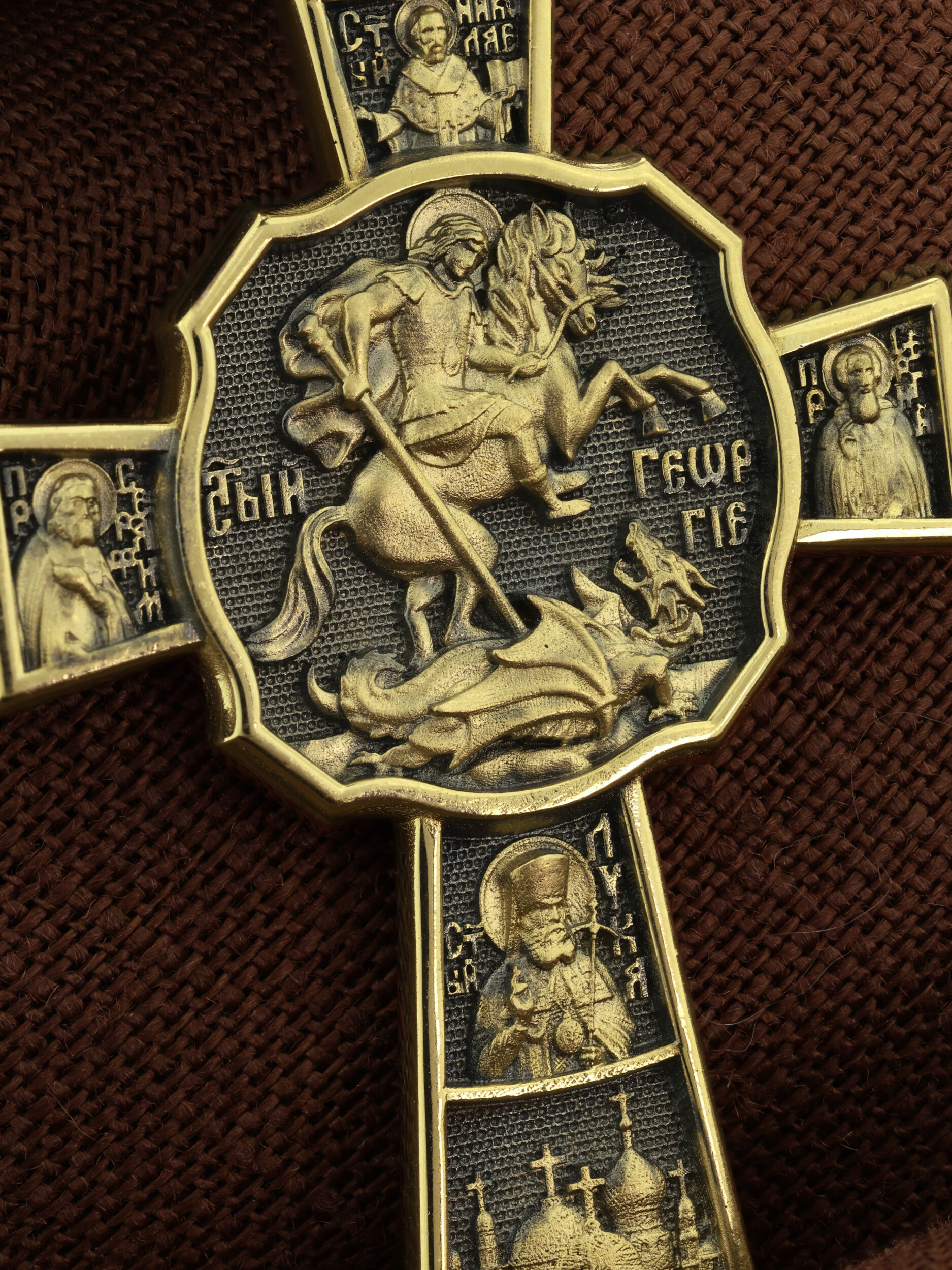 В центре оборотной стороне креста помещен образ Святого Великомученика Георгия Победоносца — одного из самых почитаемых и удивительных святых. На образке он изображен как воитель поражающий копьем огнедышащего змея. Змей символизирует собою сатанинские силы. Справа помещен образ Святого Преподобного Сергия, игумена Радонежского, чудотворца, слева — Преподобного Серафима Саровского, чудотвореца. Выше помещен образ Святителя Николая архиепископа Мир Ликийских, чудотвореца, ниже — образ святителя Луки (Войно-Ясенецкого), архиепископа Симферопольского и Крымского, исповедника и изображение Храма. На кулонном кольце изображен Спас Нерукотворный — образ Господа и Спасителя нашего Иисуса Христа, чудесно отпечатавшийся на плате, котором Христос вытер свой лик.