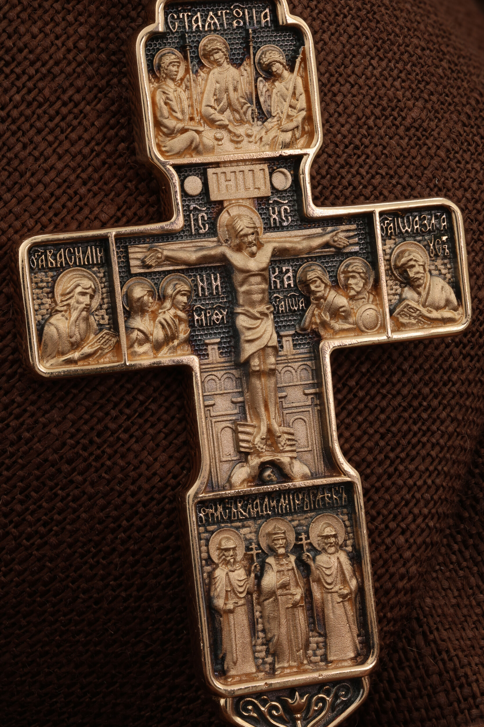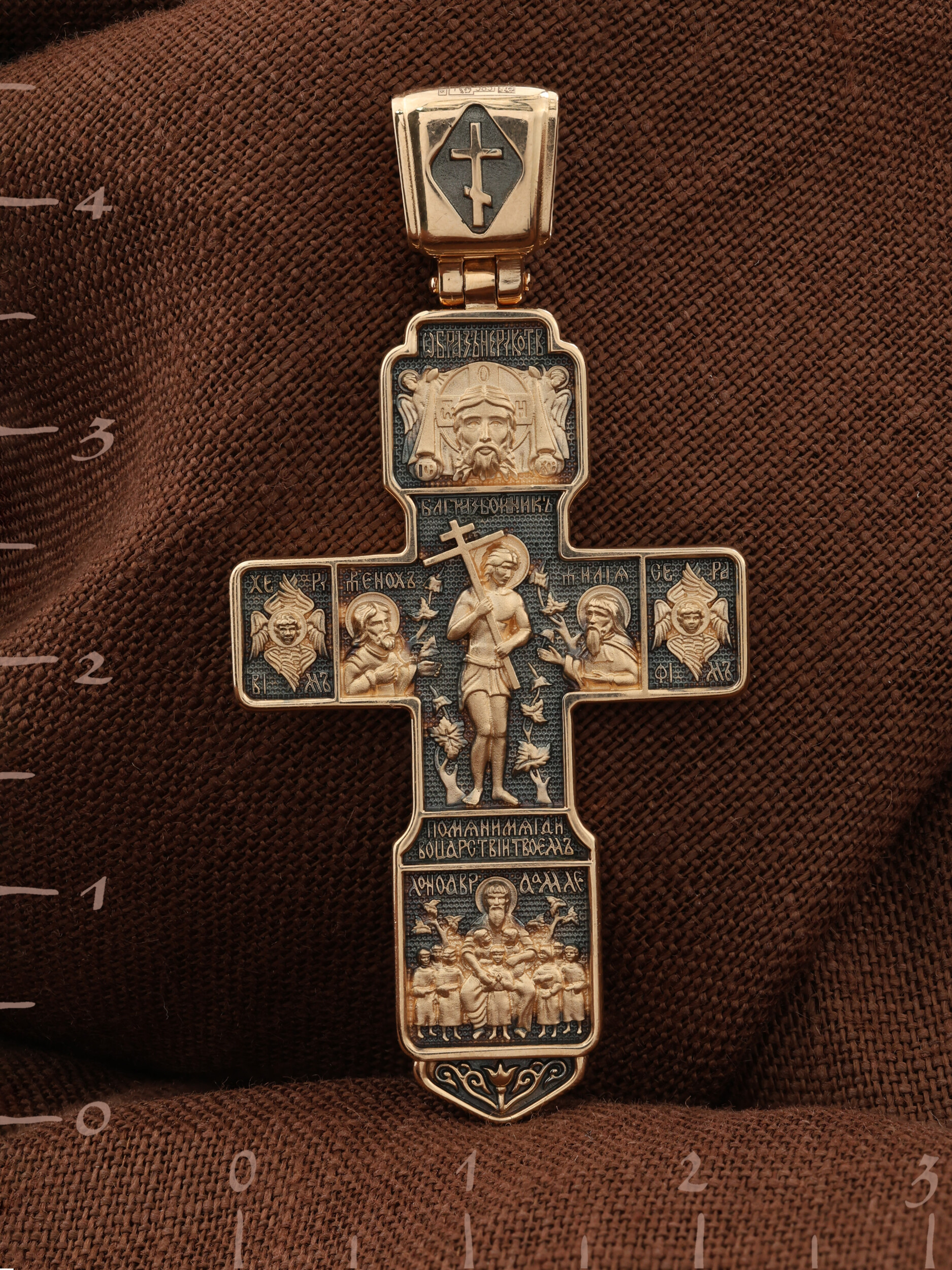В нижней части креста изображены образы первых русских святых князей-мучеников — Бориса (князь ростовский) и Глеба (князь муромский) и святого равноапостольного князя Владимира. Страстотерпцам Борису и Глебу молятся об умиротворении Отечества, о добром нраве властей и правителей, о сохранении от междоусобицы, о даровании мужества перед лицом смертельной опасности. С Борисом и Глебом неразрывно связан образ их отца — святого равноапостольного князя Владимира, который также почитается как защитник и покровитель Русской Земли и Церкви. В молитвах его называют «отец русский» или «отец всея Руси».