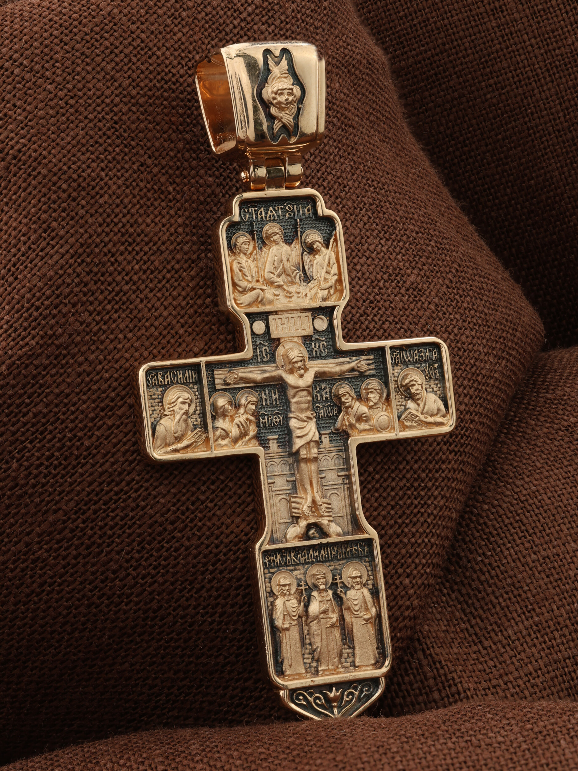 На концах горизонтальной балки креста помещены образы вселенских святителей и творцов литургии Василия Великого и Иоанна Златоуста. В кулонном кольце изображены райские врата с их стражем — Херувимом. Врата, которые открылись благодаря крестной жертве Христа.