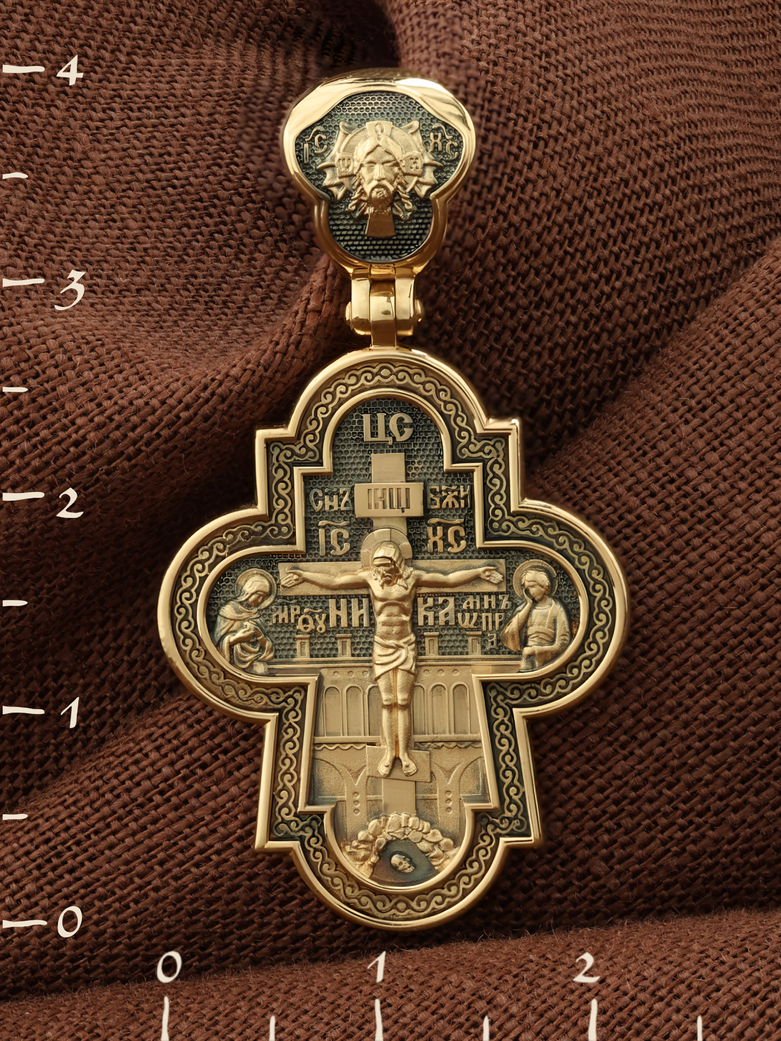 На лицевой стороне креста изображено Распятие Господа и Спасителя нашего Иисуса Христа, отдавшего Себя на смерть, для искупления грехов мира. Крест является символом жертвенной любви Всеблагого Бога к падшим людям, всепобеждающим духовным оружием христиан, основанием и средоточием церковной жизни. Господь сказал: кто хочет идти за Мною, отвергнись себя, и возьми крест свой, и следуй за Мною. (Мк. 8: 34). Над Распятием помещена надпись «Царь Славы». На верхней табличке, выше головы Иисуса, расположена надпись, составленная Понтием Пилатом — «IНЦI». Она означает «Иисус Назорей, Царь Иудейский». Надпись «IC» «ХC», означает Иисус Христос, помещается на разных сторонах поперечной перекладины креста. Возвышение, на котором стоит Крест, символизирует гору Голгофу, на которой произошло Распятие. Под подножием Креста изображена покоящаяся голова (череп) Адама. На кулонном кольце изображен Нерукотворный образ Господа и Спасителя нашего Иисуса Христа, чудесно отпечатавшийся на плате, которым Христос вытер свой лик.