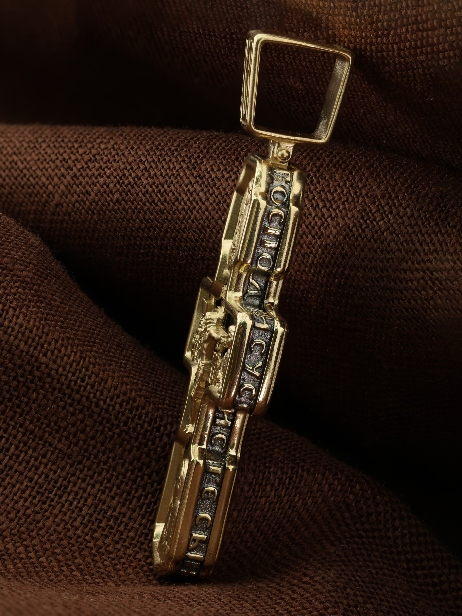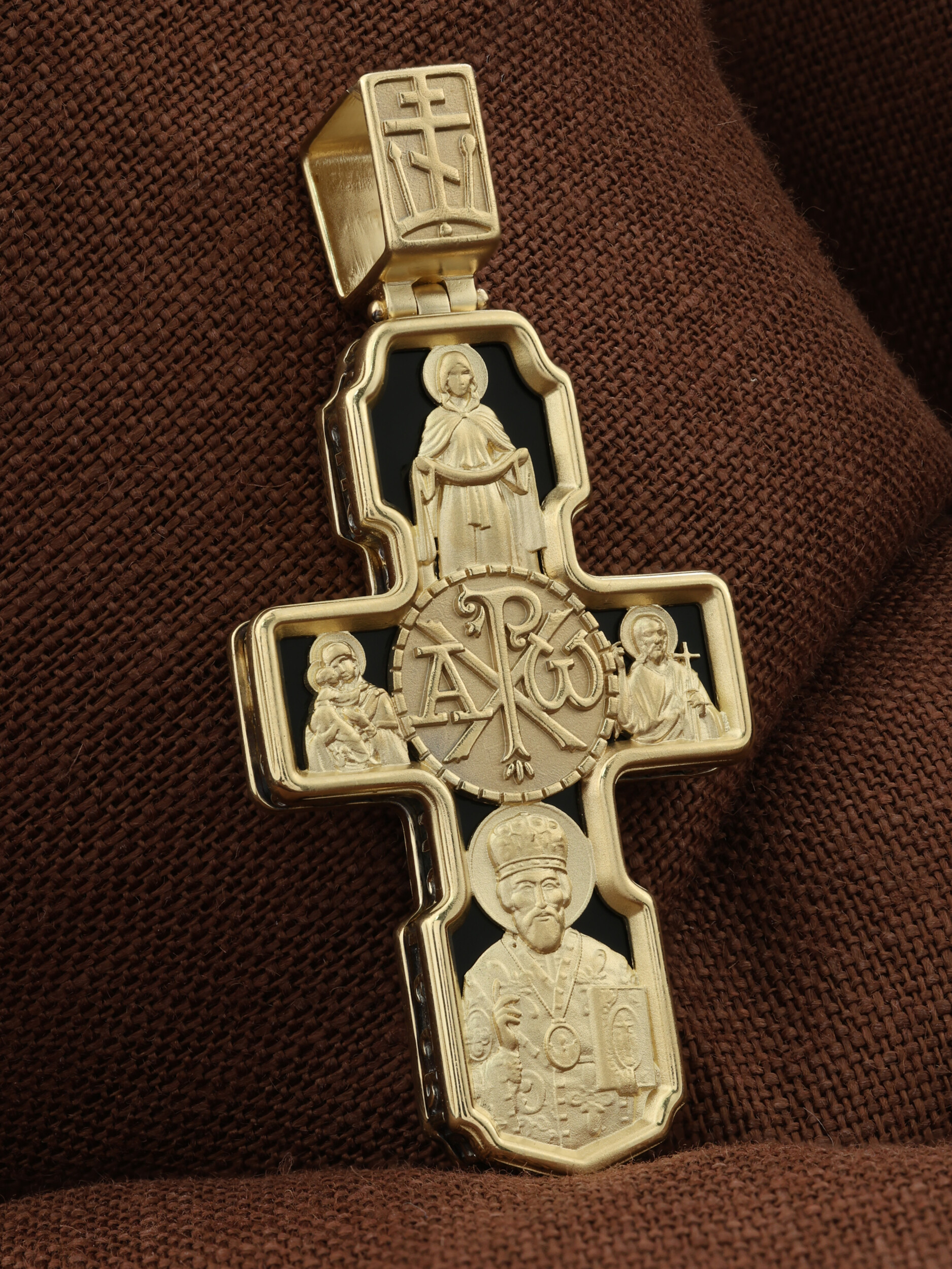 На лицевой стороне креста изображено Распятие Господа и Спасителя нашего Иисуса Христа. Христос, подвергнутый на кресте мучительной казни, своими страданиями искупил нас от древнего греха и даровал нам жизнь вечную. Без Распятия не было бы Воскресения Христова, и поэтому Крест из орудия казни обратился в святыню, в которой действует Благодать Божия. На верхней табличке, выше головы Иисуса, расположена надпись, составленная Понтием Пилатом на трех языках — «IНЦI». Она означает «Иисус Назорей, Царь Иудейский». Надпись «IС ХС» означает Иисус Христос и помещается на разных сторонах поперечной (большой) перекладины креста. На нижней перекладине находится надпись –«НИКА», что означает победитель. Над Распятием изображен Святой Ангел-Хранитель держащий крест в правой руке. Ниже Распятия — образ Святой блаженной старицы Матроны Московской. Справа — образ Свя¬того ве¬ли¬ко-му¬че¬ника и це¬ли¬теля Пан¬те¬ле¬и¬мона, а слева — образ Святителя Луки (Войно-Ясенецкого). На кулонном кольце находится надпись «ХВ», что означает Христос Воскрес. На торцевой стороне креста размещены слова Иисусовой молитвы: «Господи Иисусе Христе, Сыне Божий, помилуй мя, грешного».