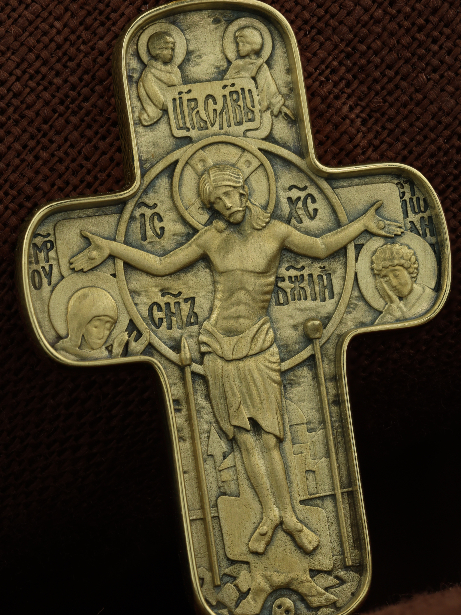 На лицевой стороне креста изображено Распятие Господа и Спасителя нашего Иисуса Христа. Христос, подвергнутый на кресте мучительной казни, своими страданиями искупил нас от древнего греха и даровал нам жизнь вечную. Без Распятия не было бы Воскресения Христова, и поэтому Крест из орудия казни обратился в святыню, в которой действует Благодать Божия. Над Распятием помещена надпись «Царь Славы». Распятие сопровождается надписями, олицетворяющими Христа: «IС» « ХС», что означает Иисус Христос и «Сын Божий». Над вершиной Распятия помещены изображения Ангелов.. Слева от Распятия изображена Пресвятая Богородица, справа — апостол и евангелист Иоанн Богослов, один из ближайших учеников Иисуса Христа. Возвышение, на котором стоит Крест, символизирует гору Голгофу, на которой произошло Распятие. Под подножием Креста изображена покоящаяся голова (череп) Адама