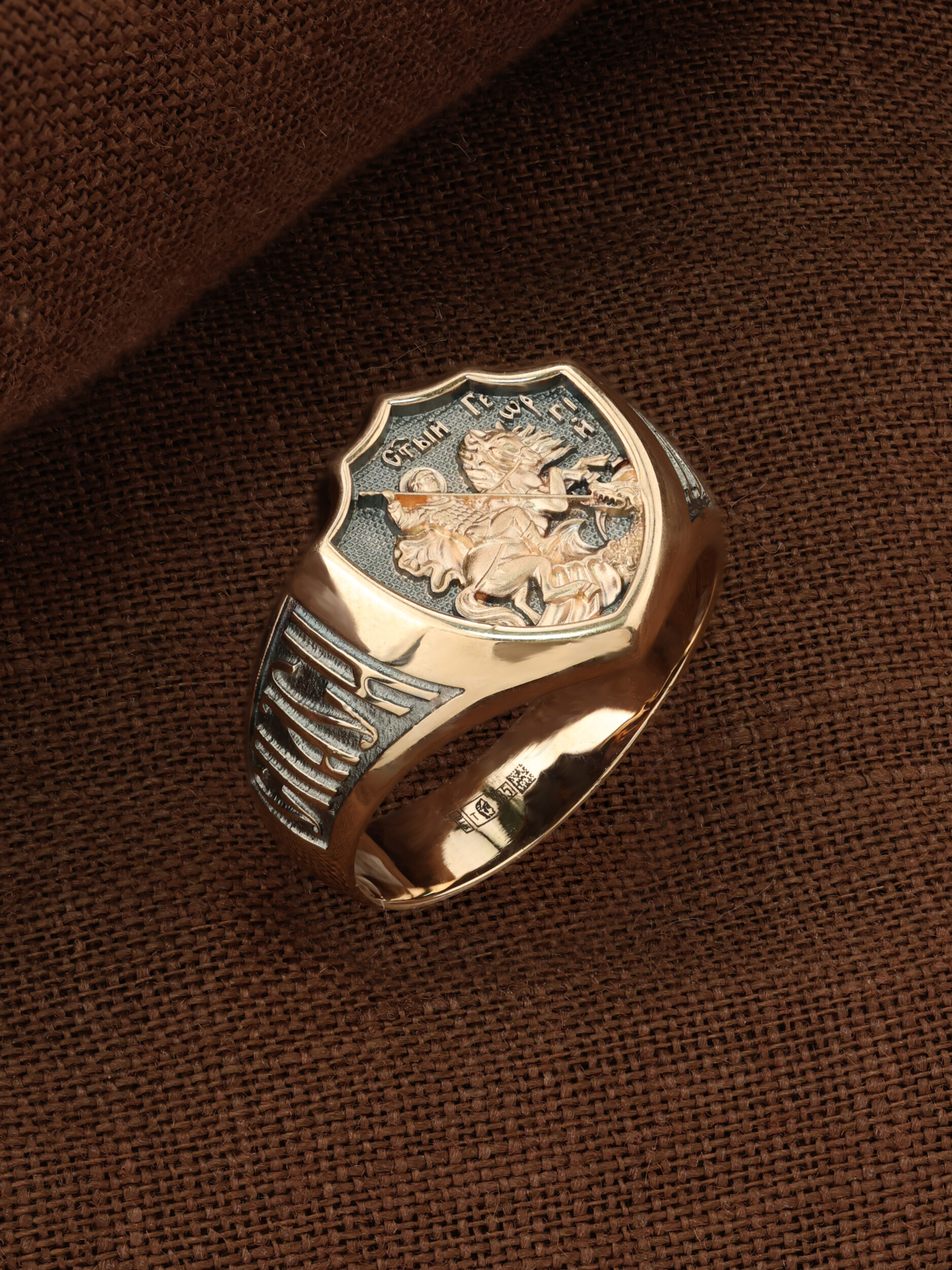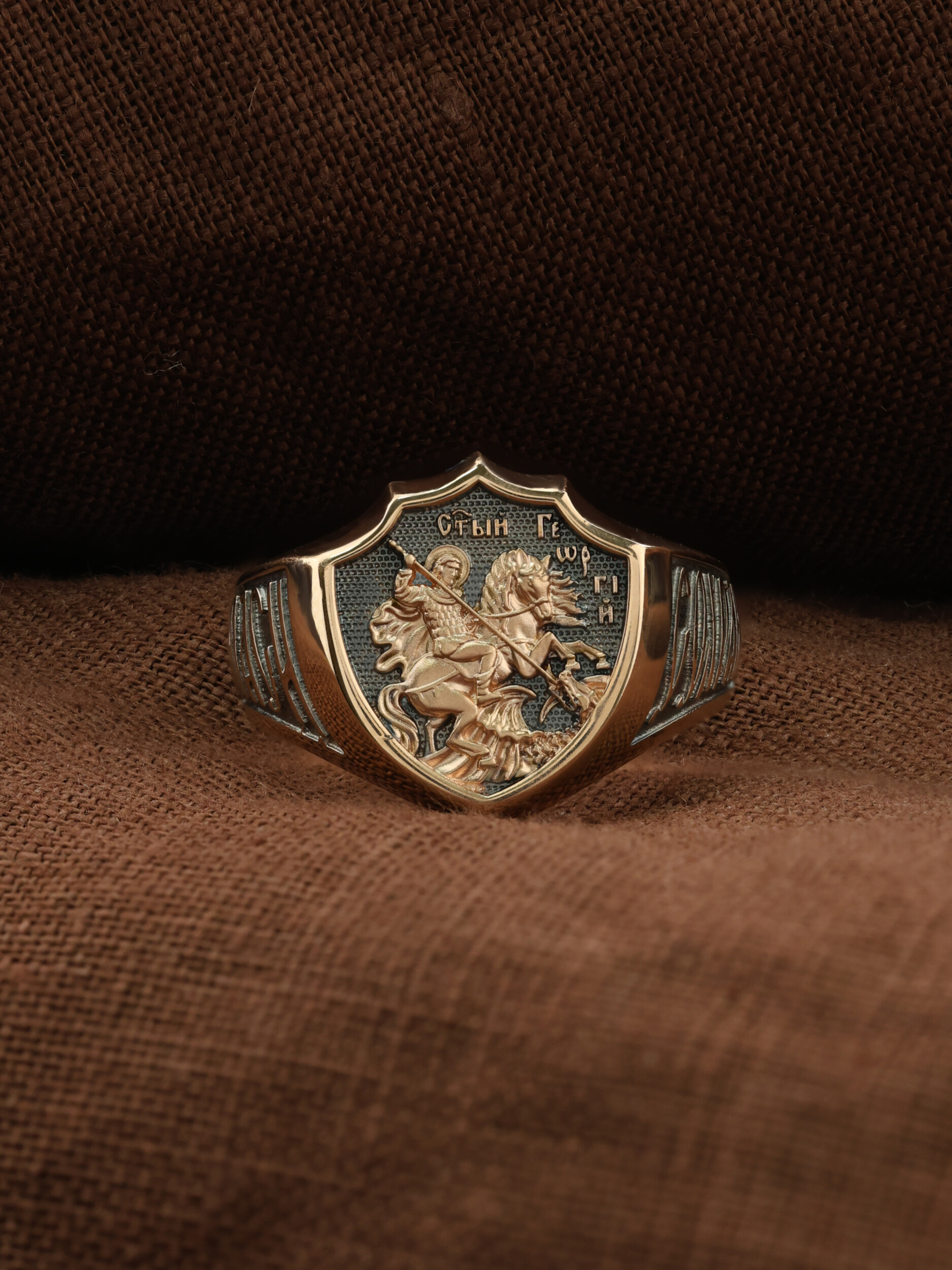 Кольцо «Святой Великомученик Георгий Победоносц» выполнено в древних христианских традициях. Основой композиции является изображение Святого Великомученика Георгия Победоносца — одного из самых почитаемых и удивительных святых. Георгий родился в Каппадокии (Малая Азия) в семье богатых и знатных горожан. Юношей поступил на службу к римскому императору Диоклетиану, за отличное знание военного дела и проявленную в боях и походах храбрость был приближен к императору и удостоен высокого воинского звания. Во время начавшихся гонений на христиан, перешел на сторону гонимых и, отвергнув человеческий страх, стал ярым проповедником учения Христа. Мучители подвергли опального воеводу жесточайшим восьмидневным пыткам и казнили его (обезглавили) в возрасте около тридцати лет в 303 году. На Руси он известен как Юрий или Егорий, заступник для верующих, чья жизнь имеет какое-либо отношение к военным делам, помощник в крестьянском труде. Георгий изображен как воитель, сидящий на вздыбленном коне и поражающий копьем огнедышащего змея. Справа над образом изображена благословляющая Божия десница. Змей символизирует собою сатанинские силы. Молитвами вознесенными к Всевышнему и своей непреклонной верой он смог одолеть чудовище. Святой убил змея, спас царскую дочь, принесенную в жертву, и жителей города, их души от влияния дьявола, породив в них надежду и веру в Господа, призывая людей принять христианскую веру.
