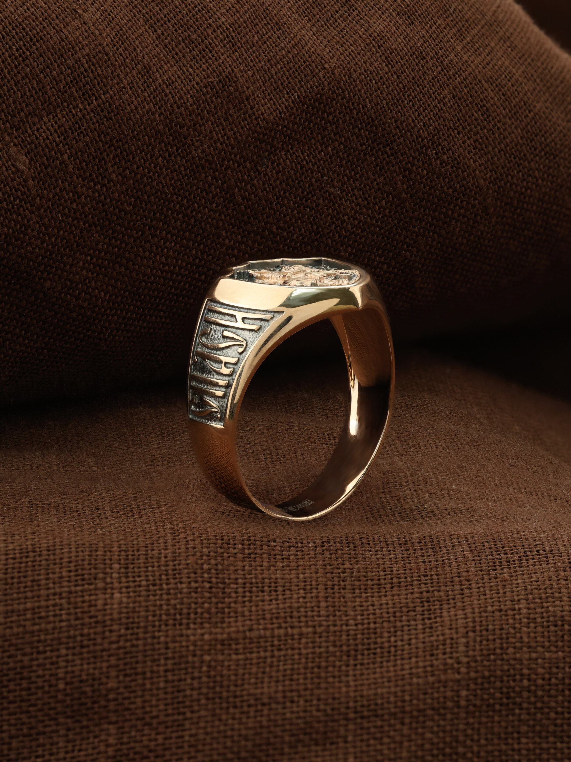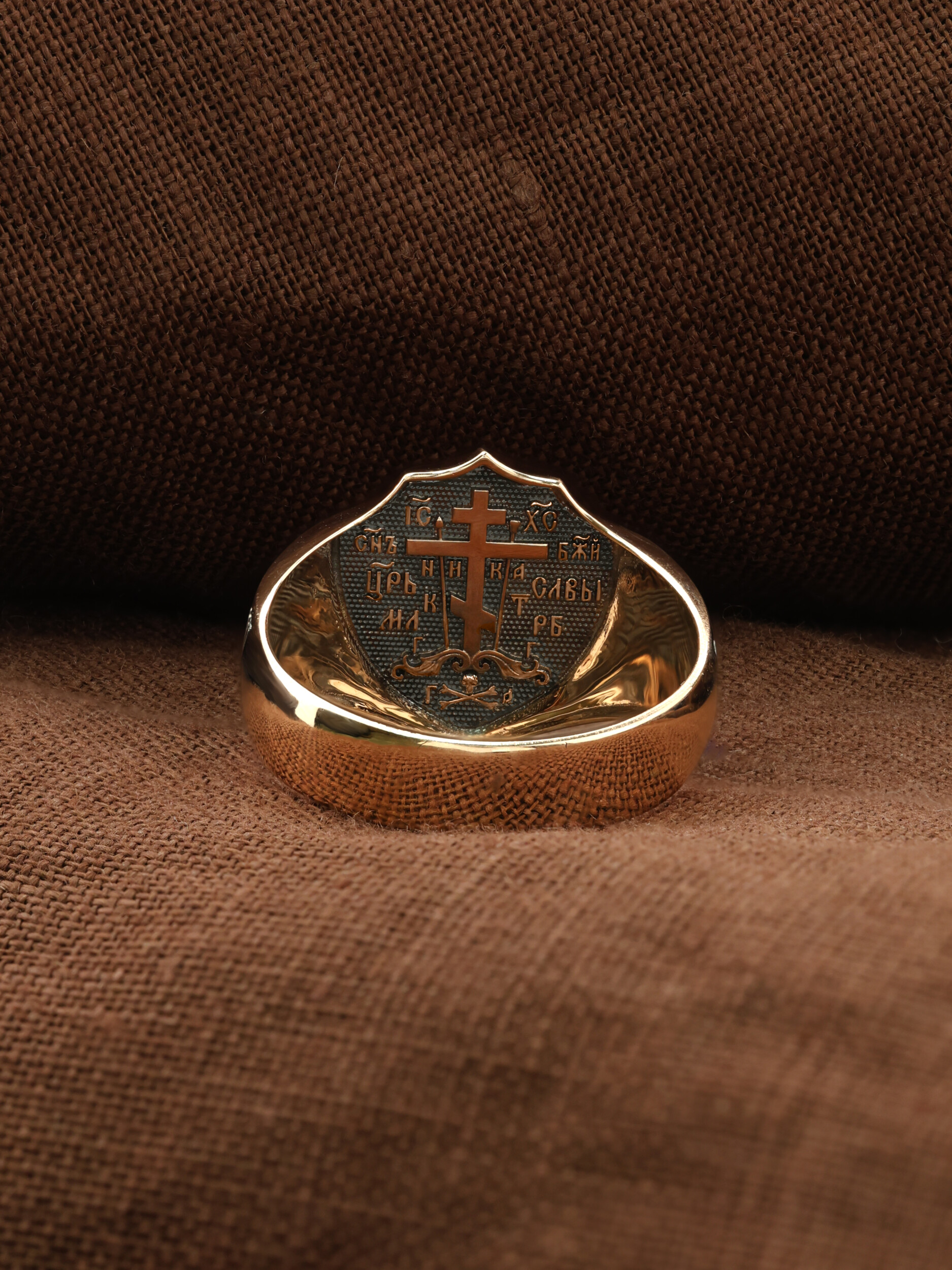 С внутренней стороны кольца изображен «Голгофский крест». Центральным и главным элементом композиции лицевой стороны является восьмиконечный крест — образ Честного и Животворящего Креста Господня, установленного на горе Голгофе. В основании креста изображена гора Голгофа, на которой был распят Спаситель и череп Адама, чьи кости по приданию омыла кровь Иисуса Христа. Перед головой располагаются лежащие кости рук, изображаются правая на левой, как при погребении или причащении. В XVI веке на Руси около изображения Голгофы появились обозначения «М.Л.Р.Б.» — Место Лобное Рай Бысть (Голгофа в переводе с еврейского — Лобное место). Чуть ниже справа и слева буквы «Г.Г.» — гора Голгофа.