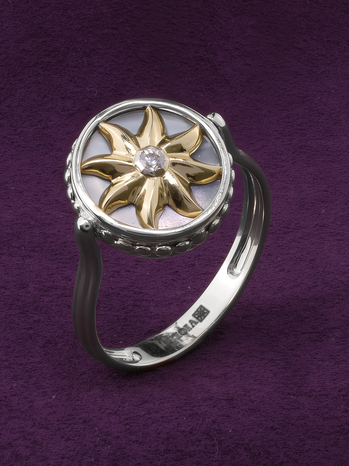 Кольцо из белого золота c бриллиантами, ониксом и перламутром
