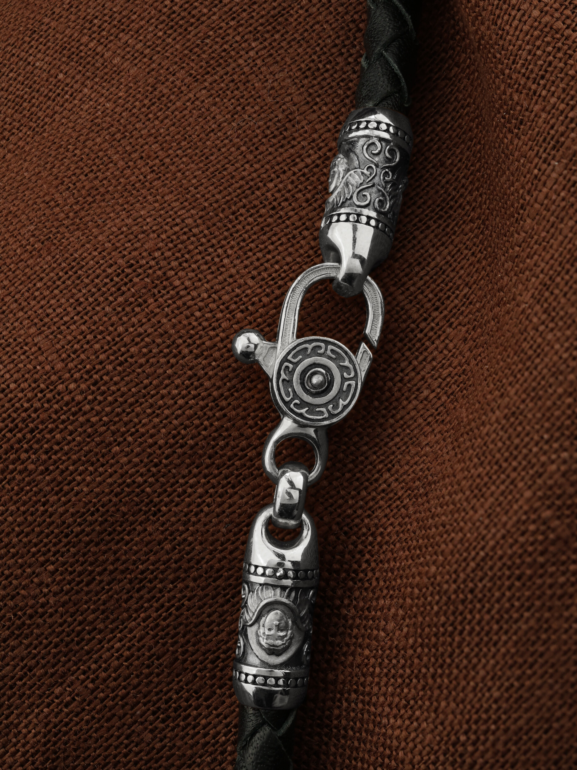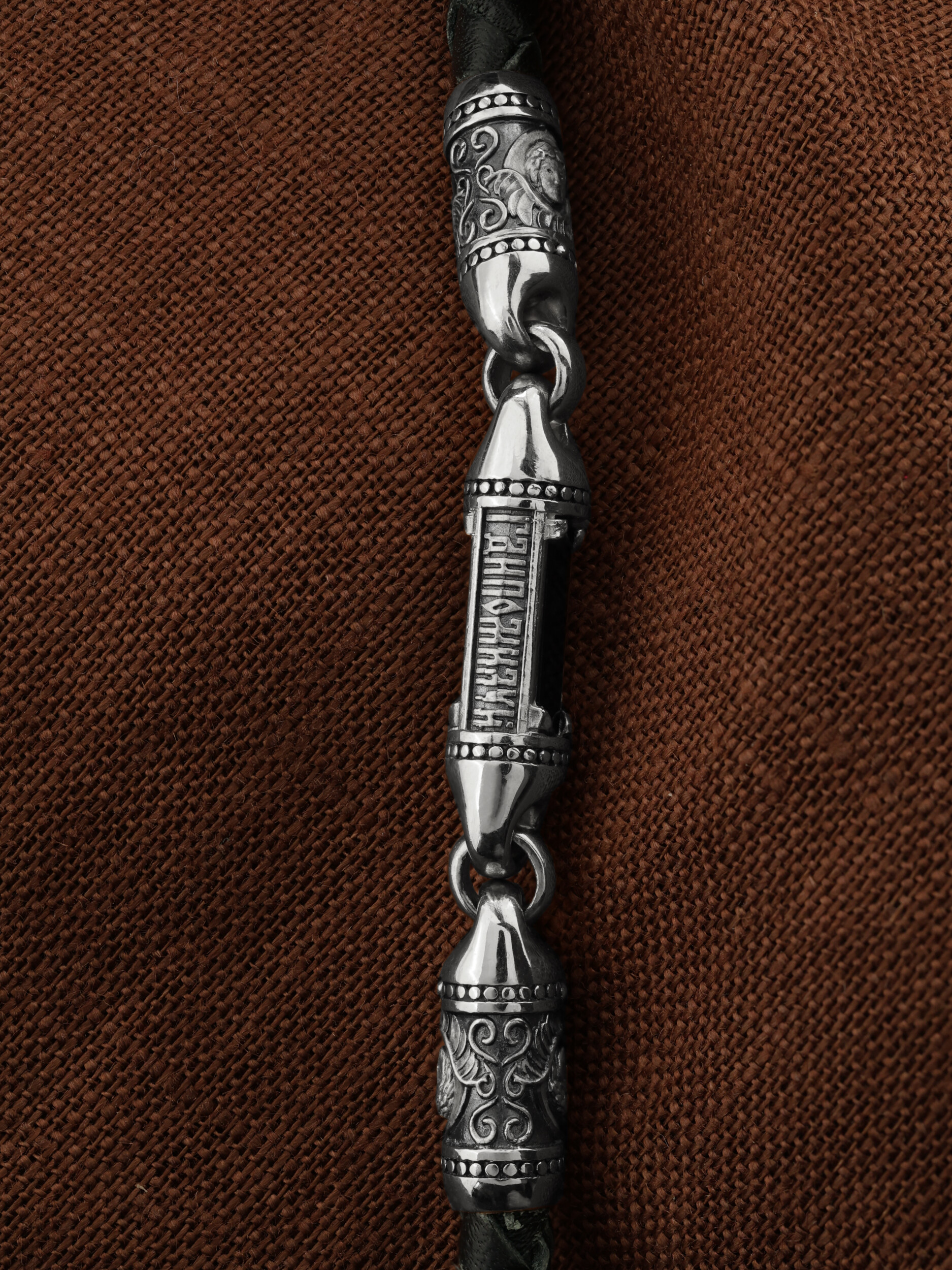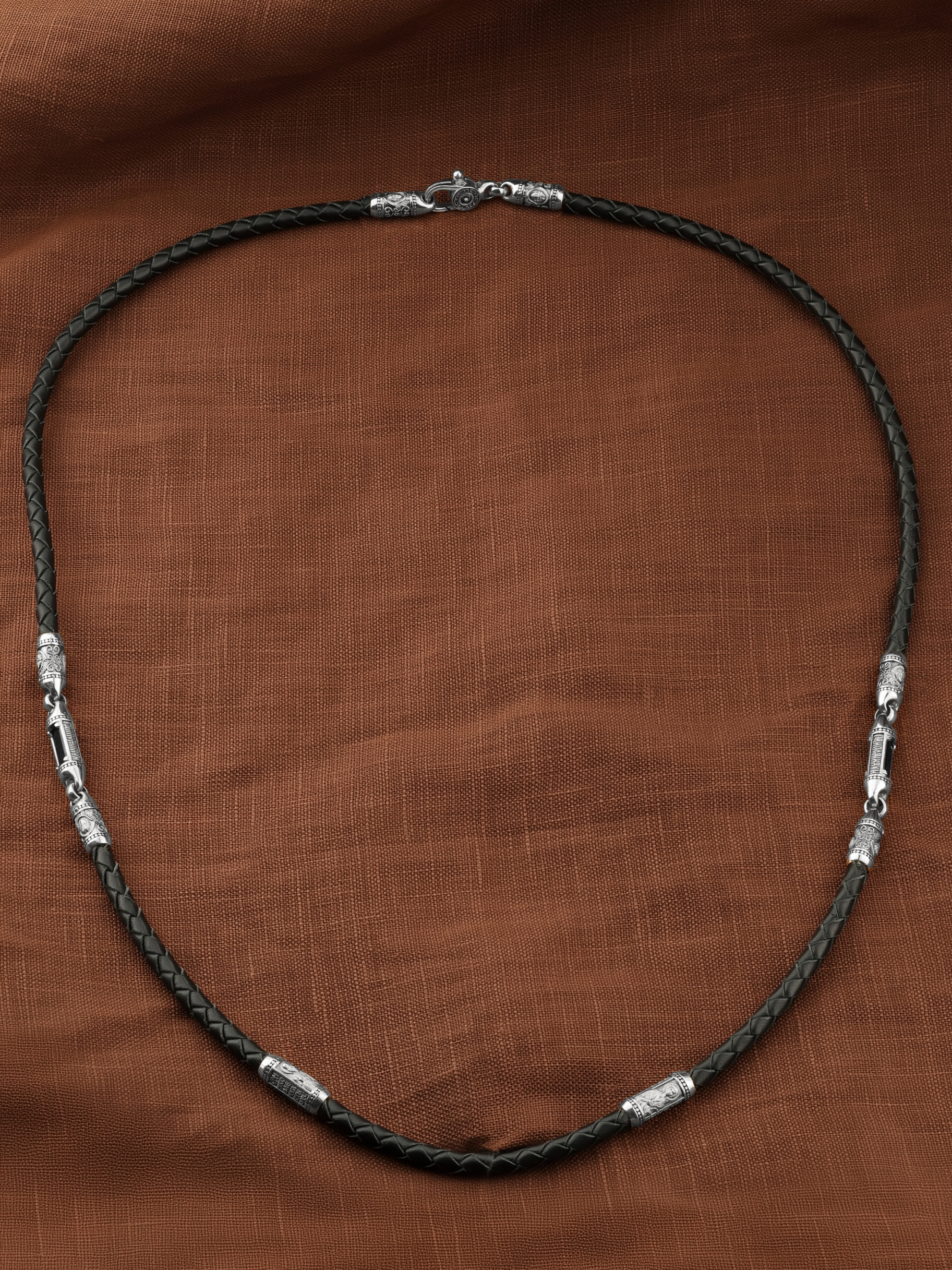 Гайтан из белого золота c кожаным шнурком и ониксом
