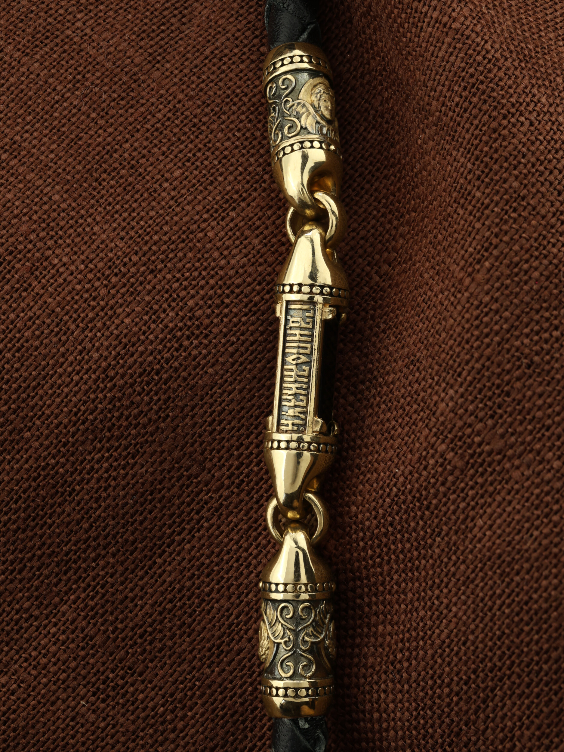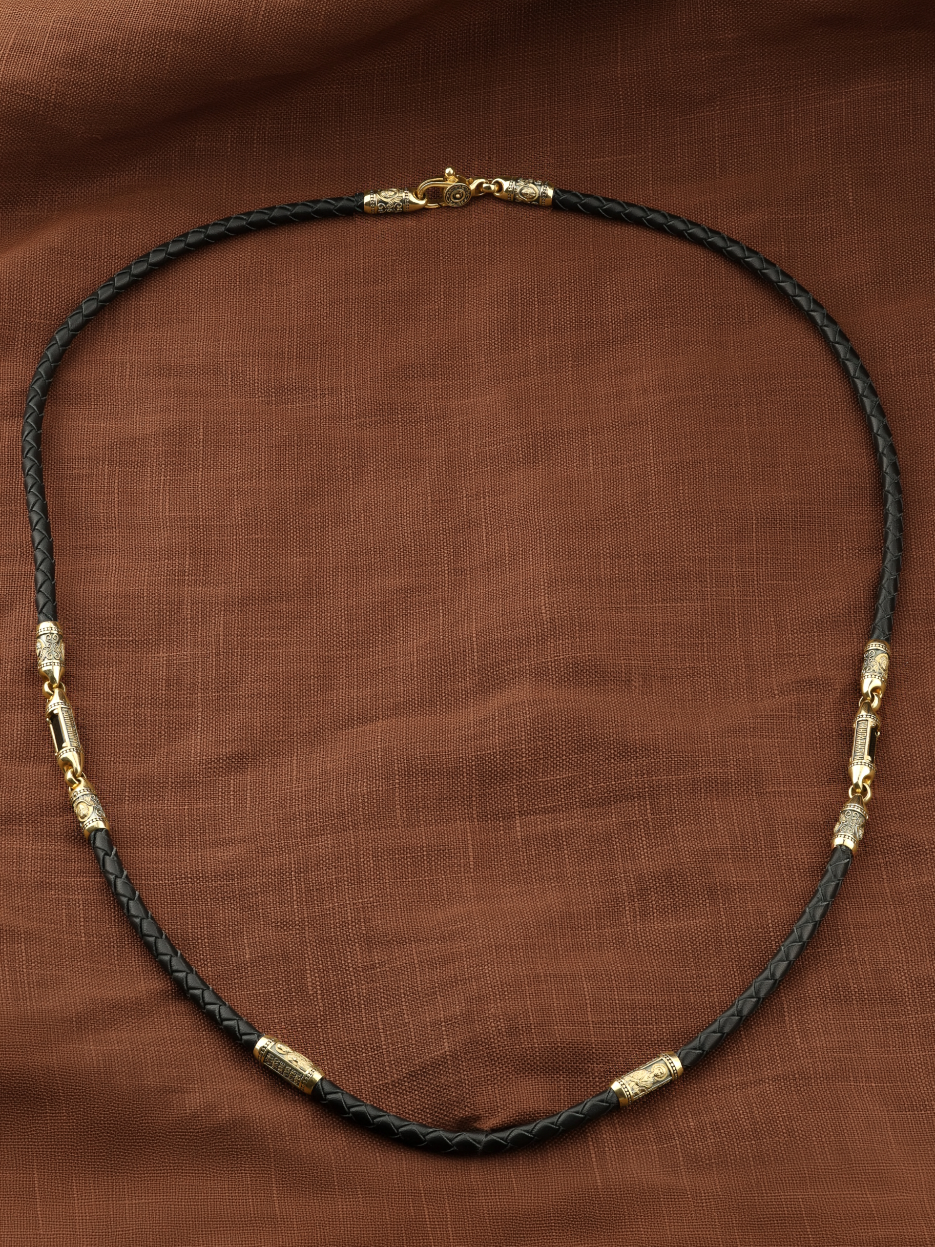 Гайтан из лимонного золота c кожаным шнурком и ониксом
