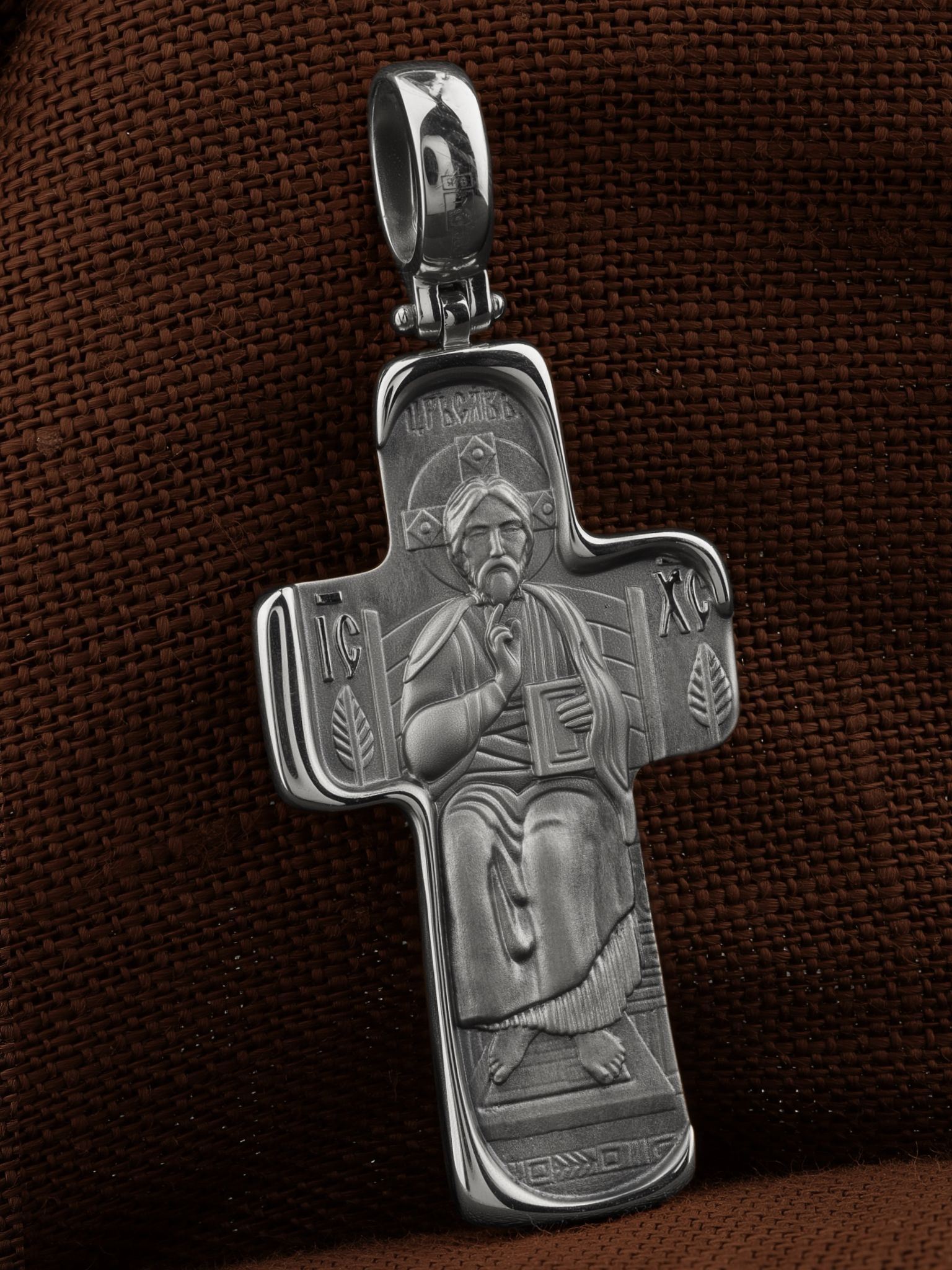 На лицевой стороне креста помещен образ Господа Иисуса Христа «Спас Вседержитель». Он изображен восседающим на престоле. Господь представлен как Царь Небесный и будущий Судия мира. Именование Иисуса «Вседержителем» указывает, с одной стороны, на Его Божественную природу: «Аз есмь Альфа и Омега, начало и конец, говорит Господь, Который есть и был и грядет, Вседержитель» (Откр. 1: 8). С другой стороны, такое именование связано и с человеческой природой Христа, искупившего крестной жертвой людские грехи и обновившего тем самым человеческую природу. В левой руке Он держит открытую Книгу, а правой рукой благословляет. Книга символизирует Евангелие — благую весть, принесенную Христом всему миру. Символизирует и Книгу Жизни, где записаны имена всех, возлюбивших Бога. Образ сопровождается каноническими надписями: «Царь Славы» и «IС ХС», что означает Иисус Христос.