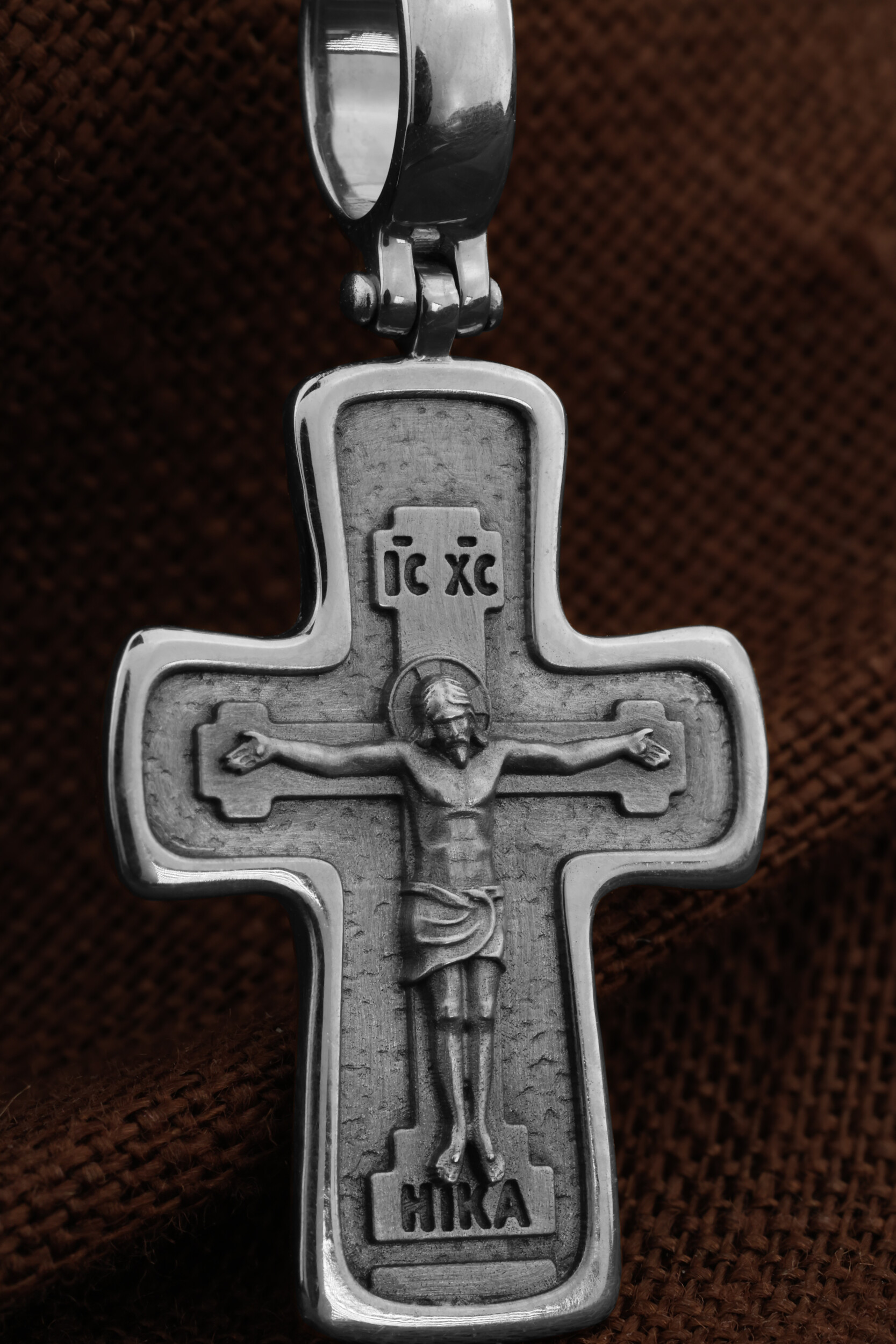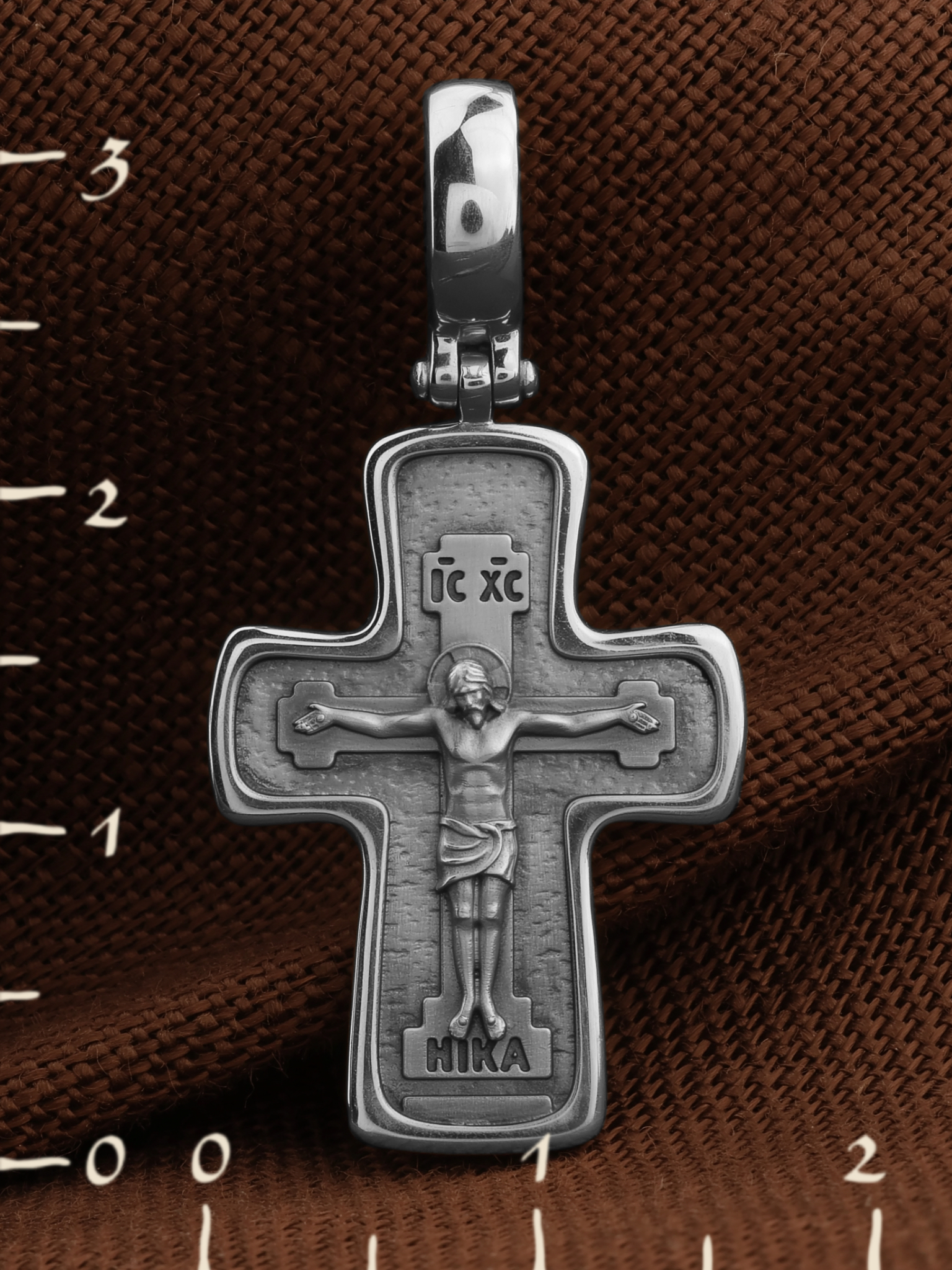На лицевой стороне креста изображено Распятие Господа и Спасителя нашего Иисуса Христа, отдавшего Себя на смерть, для искупления грехов мира. Крест является символом жертвенной любви Всеблагого Бога к падшим людям, всепобеждающим духовным оружием христиан, основанием и средоточием церковной жизни. Господь сказал: кто хочет идти за Мною, отвергнись себя, и возьми крест свой, и следуй за Мною. (Мк. 8: 34). Надпись «IС ХС» означает Иисус Христос. Надпись –«НИКА» означает победитель.