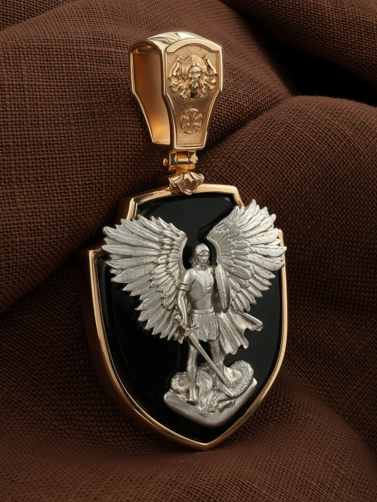 На лицевой стороне образка размещено изображение Архангела Михаила — верного служителя Божия, который низринул с Неба возгордившегося денницу с другими павшими духами. В Православии его называют Архистратигом, что означает глава святого воинства Ангелов и Архангелов. Образок сделан в виде воинского щита. Архангел Михаил изображен в воинственном виде с огненным мечом в правой руке и щитом в левой поражающим змея. Змей символизирует собою сатанинские силы. Архангел почитается, как покровитель воинов и всех верных Богу и ведущих борьбу против сил зла, борец против ересей, а также защитник душ умерших, страж райских врат. С древних времен прославлен своими чудесами Архангел Михаил на Руси. Примеров явления и помощи Архистратига Михаила в русской истории бессчетно. Архангел Михаил не перестает ратоборствовать за славу Творца и Господа всяческих, за дело спасения рода человеческого, за церковь и чад ее. И, согласно, Откровению Иоанна Богослова во время последней битвы небесных и дьявольских сил Михаил и его ангелы опять низвергнут люцифера вместе с его войском: «Михаил и Ангелы его воевали против дракона, и дракон и ангелы его воевали [против них], но не устояли, и не нашлось уже для них места на небе. И низвержен был великий дракон, древний змий, называемый диаволом и сатаною, обольщающий всю вселенную, низвержен на землю, и ангелы его низвержены с ним» (Откр.12:7−9). На кулонном кольце изображен Нерукотворный образ Господа и Спасителя нашего Иисуса Христа, чудесно отпечатавшийся на плате, которым Христос вытер свой лик.