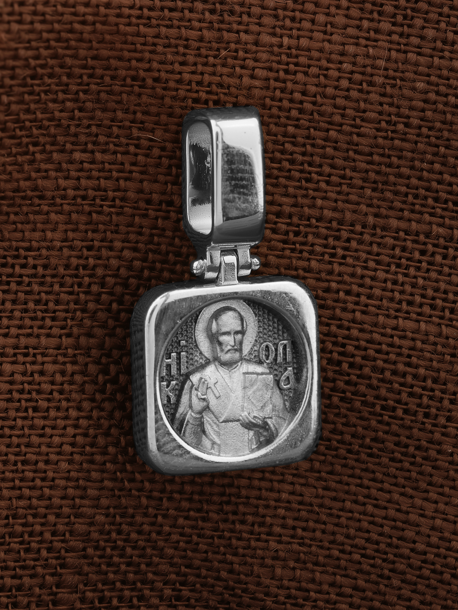 На лицевой стороне образка изображен Святитель Николай архиепископ Мир Ликийских, Чудотворец. Он является одним из самых почитаемых святых в православном мире. Святитель Николай родился во второй половине III века в Малой Азии в Ликийском городе Патары. С рождения Божий Угодник проявлял необыкновенные дарования. Сохранилось Предание, что во время крещения он, никем не поддерживаемый, простоял в купели три часа. Приняв сан священника, святитель Николай стал проводить еще более строгую подвижническую жизнь. Избранник Божий Николай стал вершиной всех добродетелей, поднятой до райской высоты. С кем из величайших праведников не сравнялся он образом духовной красоты, кому из них не последовал в своих деяниях и чудотворениях? Вся жизнь святого Николая — это служение Богу. Много великих и преславных чудес сотворил великий Святитель Николай Угодник. Он помогал сущим в бедах, укрощал штормы, спасал от потопления и выносил на сушу из глубины морской, освобождал из плена и приносил освобожденных домой, избавлял от уз и темницы, защищал от посечения мечом, освобождал от смерти и подавал многим различные исцеления: слепым — прозрение, хромым — хождение, глухим — слух, немым — дар слова.
