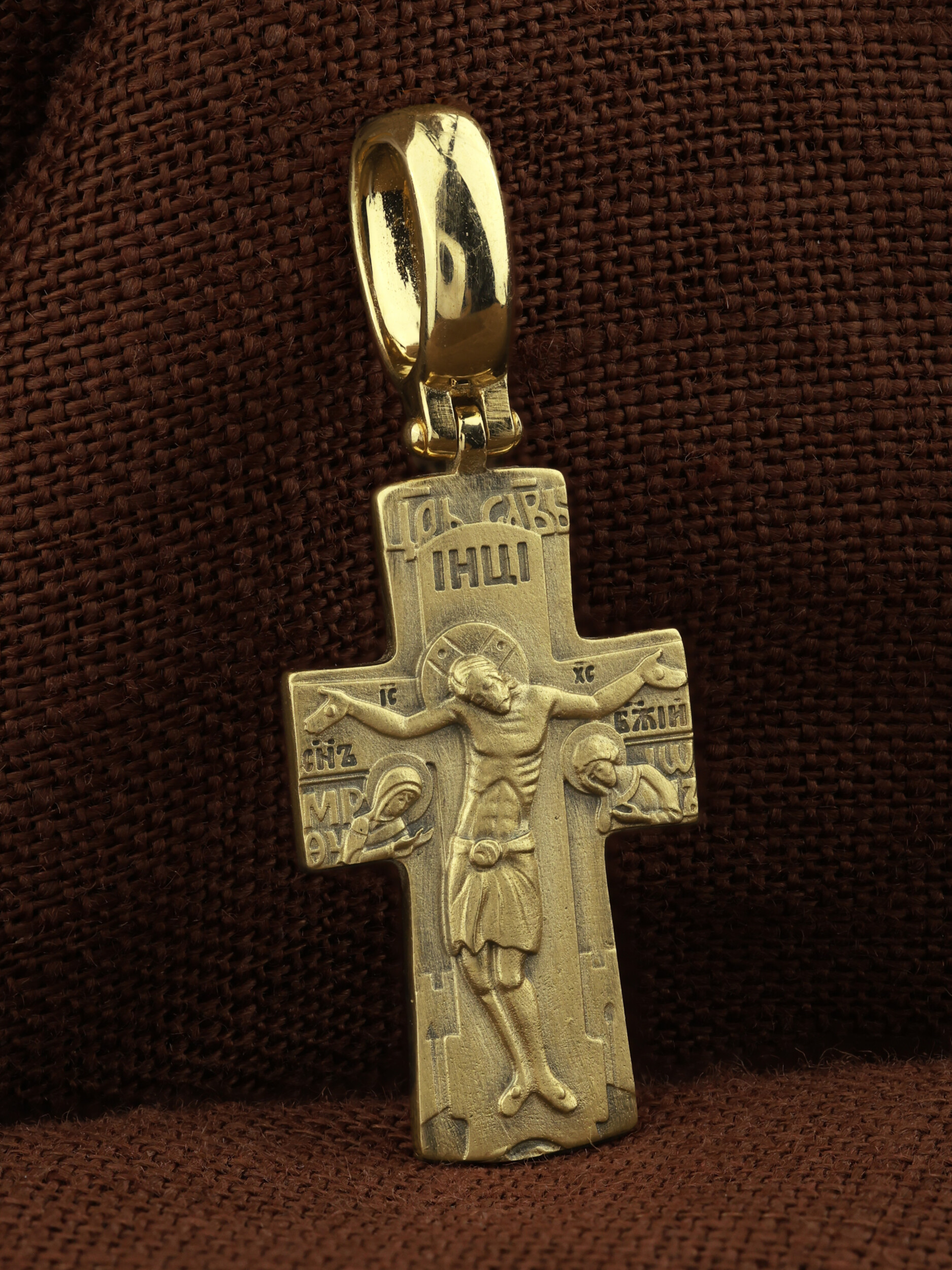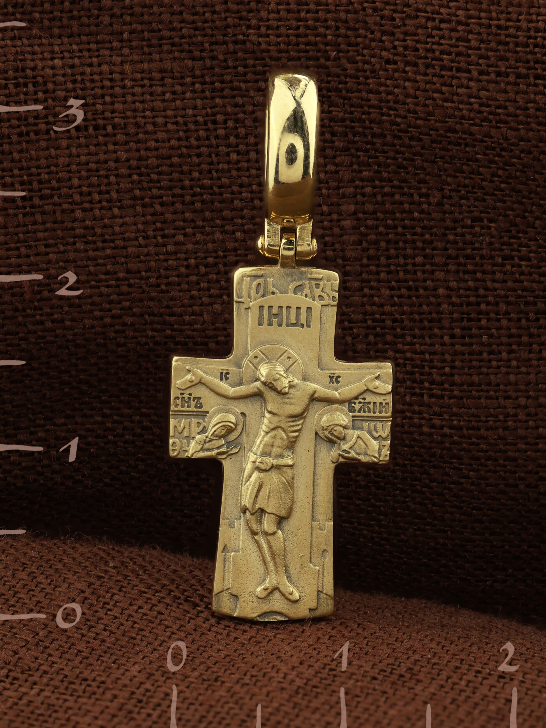 На лицевой стороне креста изображено Распятие Господа и Спасителя нашего Иисуса Христа, отдавшего Себя на смерть, для искупления грехов мира. Крест является символом жертвенной любви Всеблагого Бога к падшим людям, всепобеждающим духовным оружием христиан, основанием и средоточием церковной жизни. Над вершиной Распятия помещена надпись «Царь Славы». На верхней табличке, выше головы Иисуса, расположена надпись, составленная Понтием Пилатом — «IНЦI». Она означает «Иисус Назорей, Царь Иудейский». Распятие сопровождается каноническими надписями. Надпись «IC» «ХC», означает Иисус Христос и словосочетание «СЫН БОЖИЙ», что означает божественную природу Иисуса Христа, помещаются на разных сторонах поперечной перекладины креста. Слева от Распятия изображена Пресвятая Богородица, справа — апостол и евангелист Иоанн Богослов, один из ближайших учеников Иисуса Христа. Вдоль креста изображены копие сотника Лонгина и трость с губкой. За Распятием высится Иерусалимская стена, в знак того, что Господь был распят вне стен города.