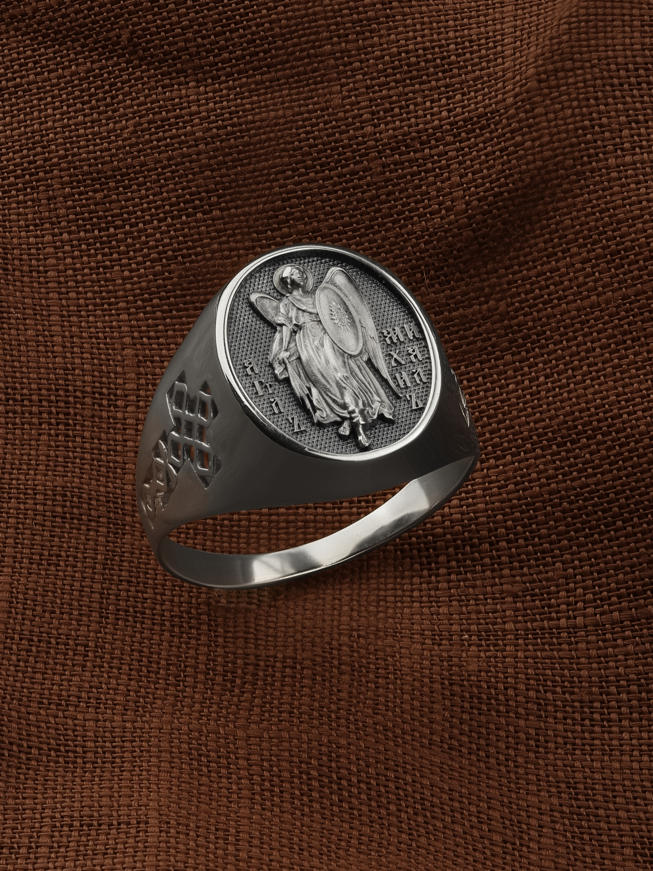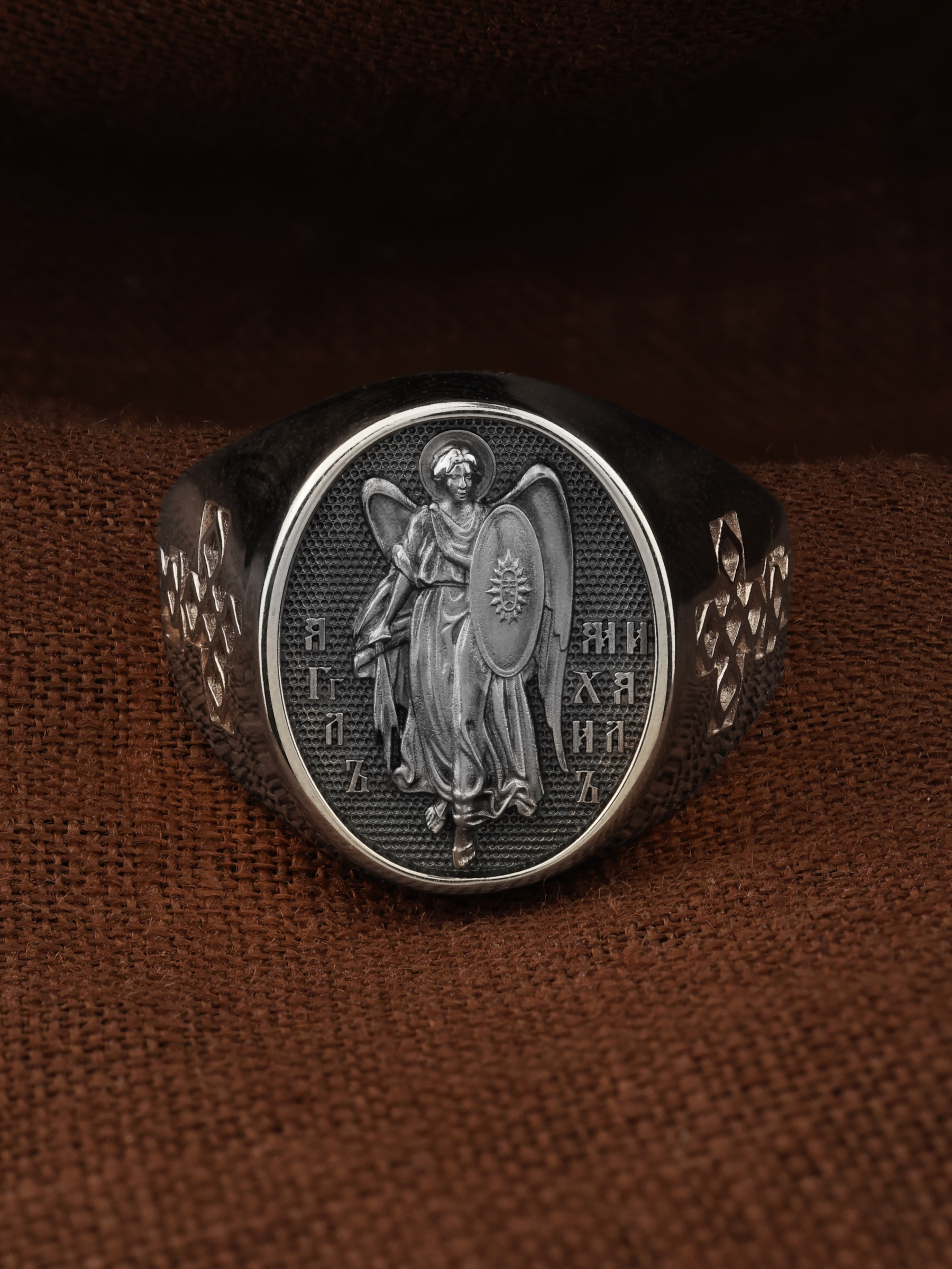 Кольцо «Архангела Михаила» выполнено в древних христианских традициях. В центре помещен образ Архангела Михаила — верного служителя Божия, который низринул с Неба возгордившегося денницу с другими павшими духами. Он изображен в воинственном виде с огненным мечом в правой руке и щитом в левой. В Православии его называют Архистратигом, что означает глава святого воинства Ангелов и Архангелов. Вокруг образа размещена молитва: «Кресту твоему поклоняемся, Христе, честному хранителю мира, спасения нас грешных, велию очистилищу, верным победе».