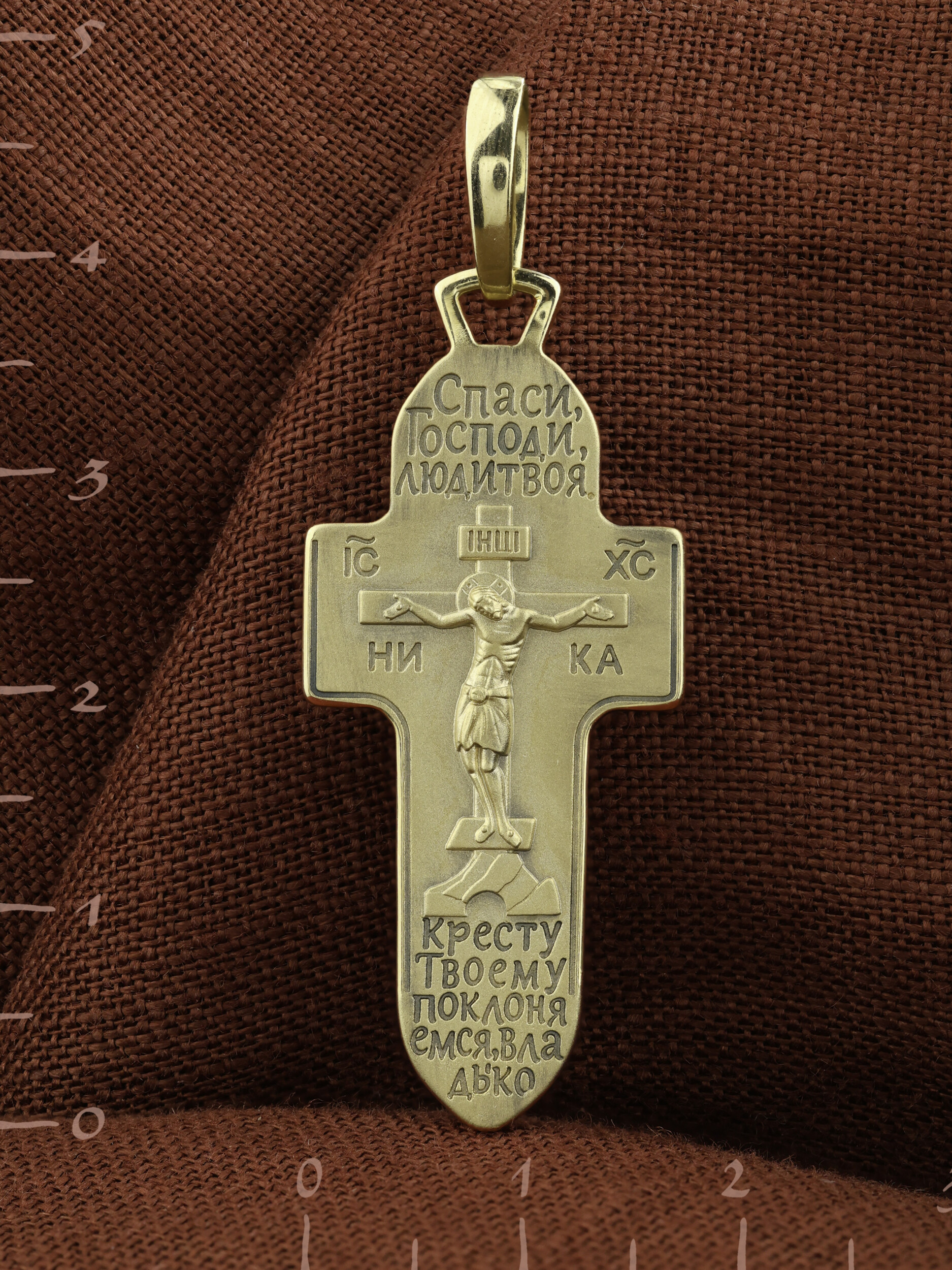 На лицевой стороне креста изображено Распятие Господа и Спасителя нашего Иисуса Христа. Крест- символ спасения и искупления рода человеческого, знамение победы над смертью и адом. Иисус Христос, как искупительная жертва освобождения человечества от власти греха, умер крестной смертью и в третий день воскрес. На верхней табличке, выше головы Иисуса, расположена надпись, составленная Понтием Пилатом — «IНЦI». Она означает «Иисус Назорей, Царь Иудейский». Надпись «IC» «ХC», означает Иисус Христос, помещается на разных сторонах поперечной перекладины креста. Под ней помещено слово «НIКА», что означает Победитель. Крест стоит на горе камней, символизирующих Голгофу.