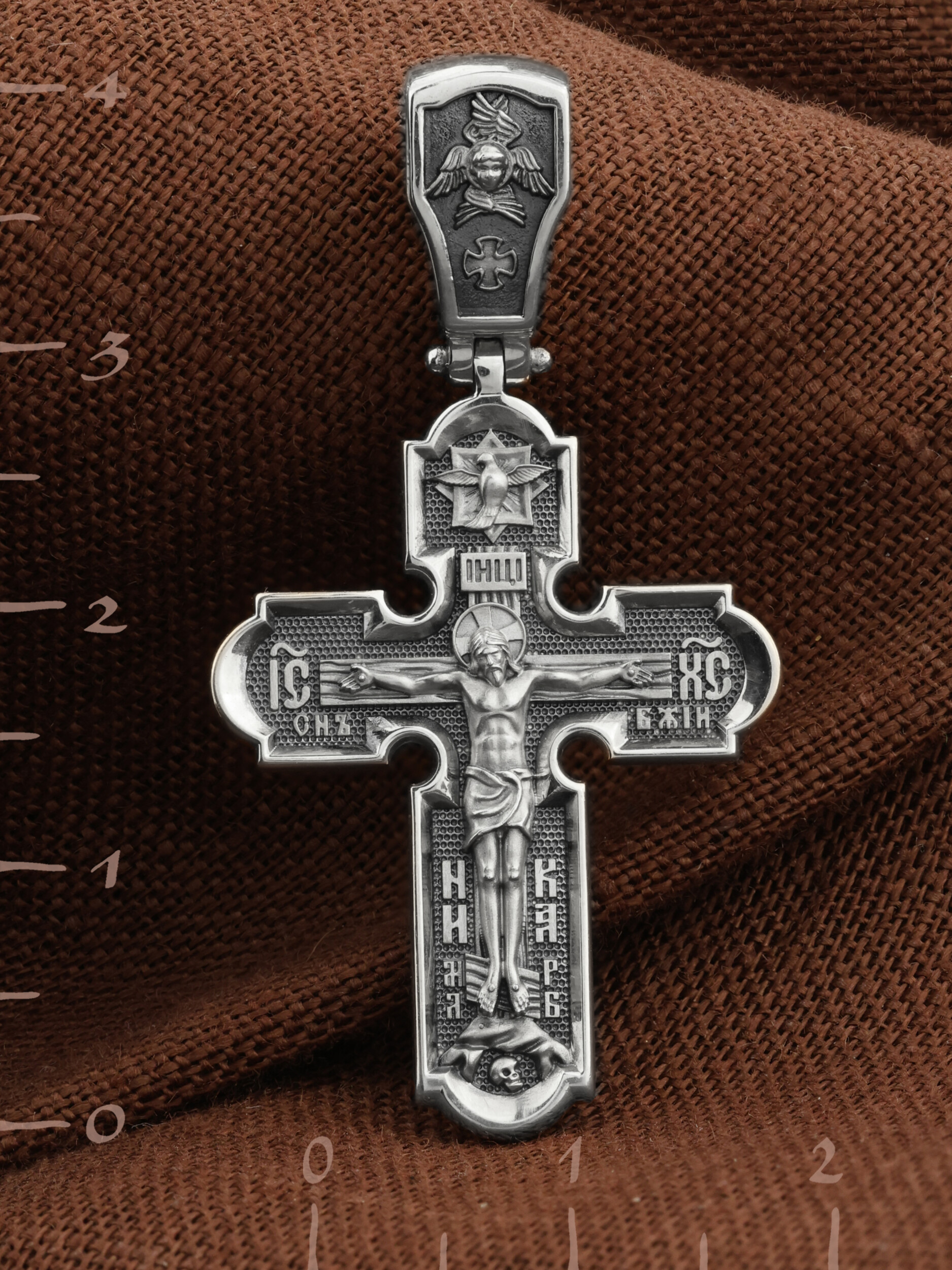 На лицевой стороне креста изображено Распятие Иисуса Христа. Господь представлен свободно покоящимся на кресте с простертыми руками и как бы обнимающим всю Вселенную. Верхняя перекладина символизирует титло — табличку, на которой, согласно Евангелию, было начертано: Иисус Назорей Царь Иудейский (IНЦI). Также Распятие сопровождается надписями, олицетворяющими Христа: святое имя Христа «IC» (Иисус) «ХС» (Христос), и словосочетание «СНЪ БЖIЙ» — СЫН БОЖИЙ. Рядом с образом Христа помещены слова — «НИКА» (греч. — Победитель) и четыре буквы «МЛ» «РБ» — Место Лобное Рай Бысть. Возвышение, на котором стоит Крест, символизирует гору Голгофу, на которой произошло Распятие. У подножия Креста изображают прах Адама, обозначенный черепом. На кулонном кольце изображен шестикрылый Серафим — самый приближенный к Господу Ангел.