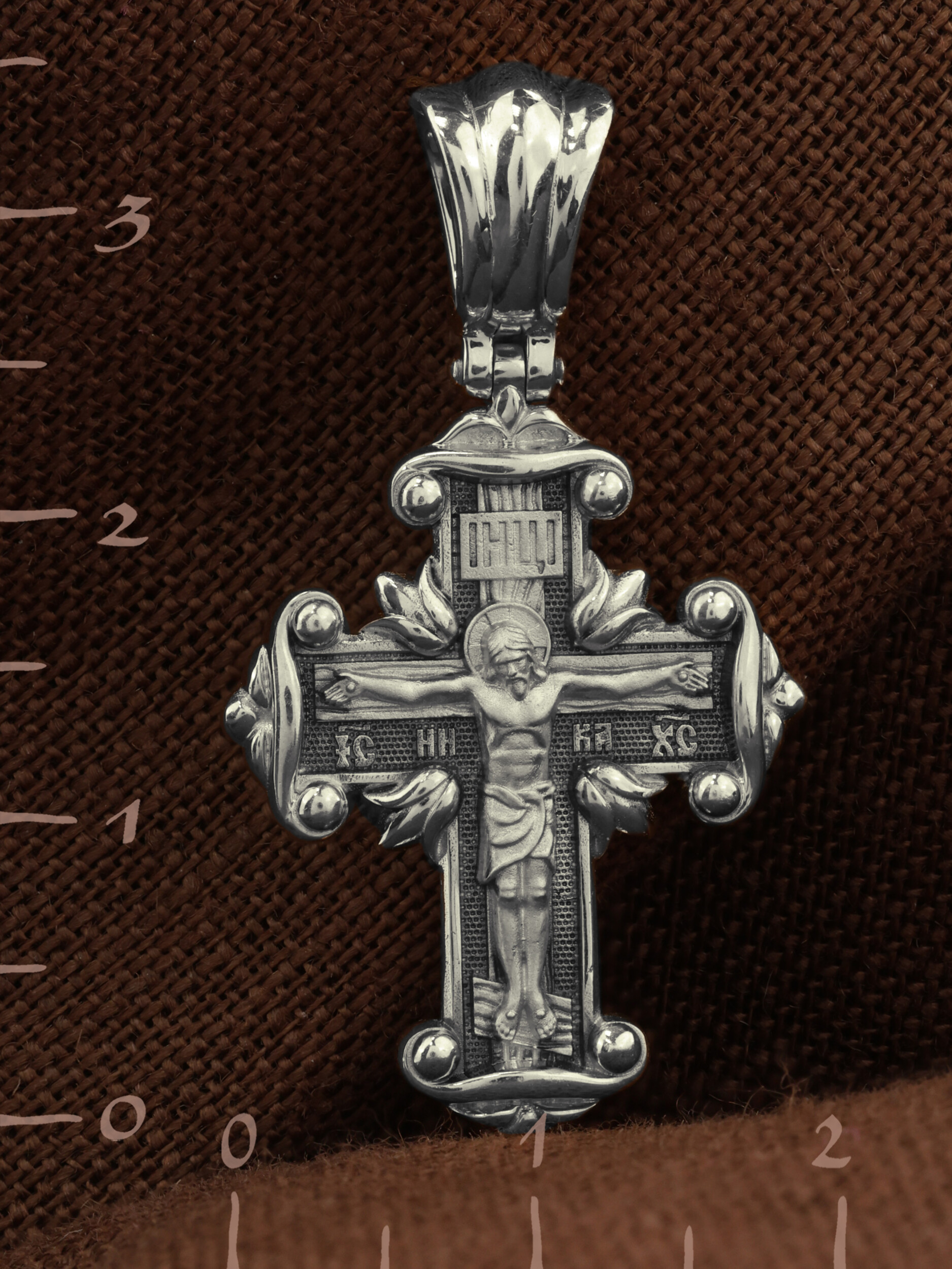 На лицевой стороне креста изображено Распятие Господа и Спасителя нашего Иисуса Христа, отдавшего Себя на смерть, для искупления грехов мира. Крест является символом жертвенной любви Всеблагого Бога к падшим людям, всепобеждающим духовным оружием христиан, основанием и средоточием церковной жизни. Господь сказал: кто хочет идти за Мною, отвергнись себя, и возьми крест свой, и следуй за Мною. (Мк. 8: 34). На верхней табличке, выше головы Иисуса, расположена надпись, составленная Понтием Пилатом — «IНЦI». Она означает «Иисус Назорей, Царь Иудейский». Надпись «IC» «ХC», означает Иисус Христос, помещается на разных сторонах поперечной перекладины креста. Рядом — слово «НИКА», что означает «победитель». На православном кресте Христос не умирает, а свободно простирает руки, ладони Иисуса открыты, будто он хочет обнять все человечество, даря им свою любовь и открывая путь к вечной жизни.